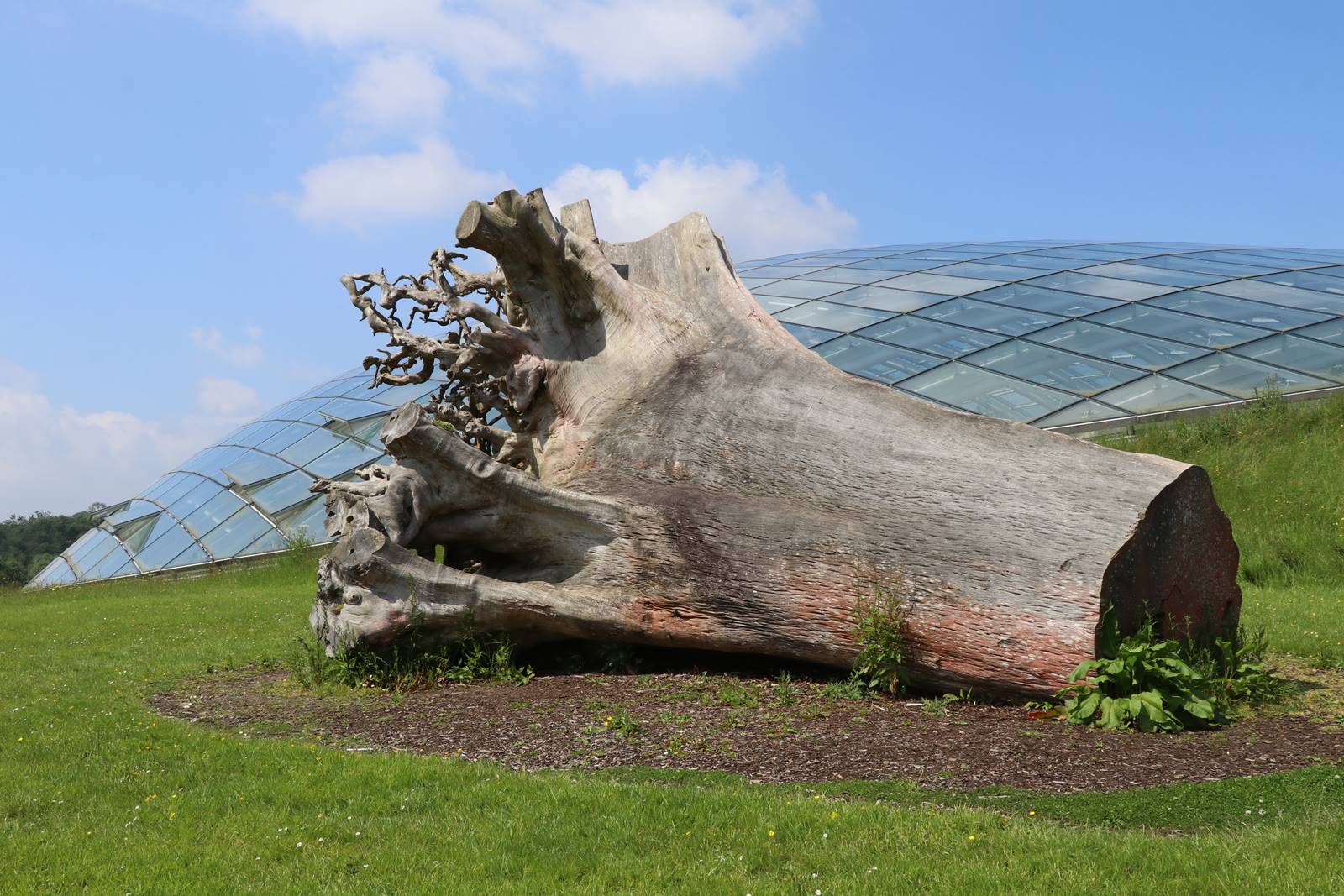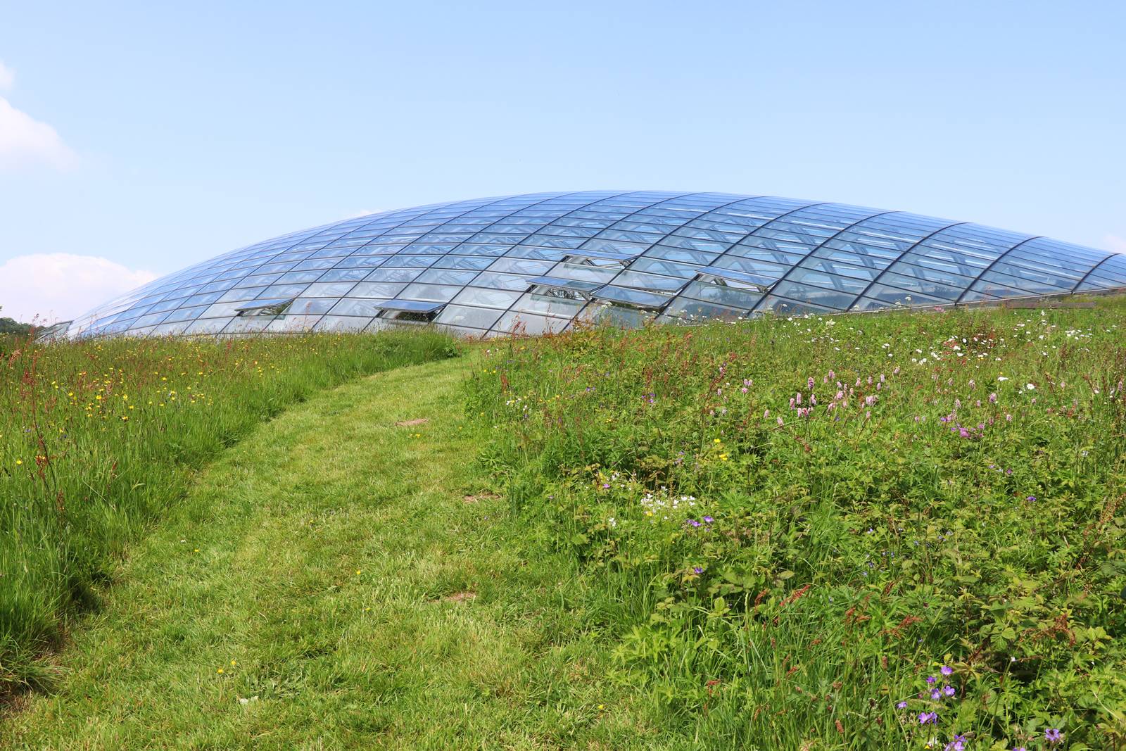 The Great Glasshouse est posé dans le paysage telle une goutte de pluie géante. Mesurant 110 mètres de long, la serre conçue par Norman Foster est la plus grande serre à travée unique au monde. Son dôme de verre entouré d’un talus tapissé de gazon couvre une superficie d’un demi hectare. (voir mes reportages sur les serres d’Eden Project en Cornouailles, sur les Serres du Jardin botanique de Kew en Angleterre, sur la Serre de Lednice en Tchéquie et sur les Serres Royales de Laeken en Belgique)