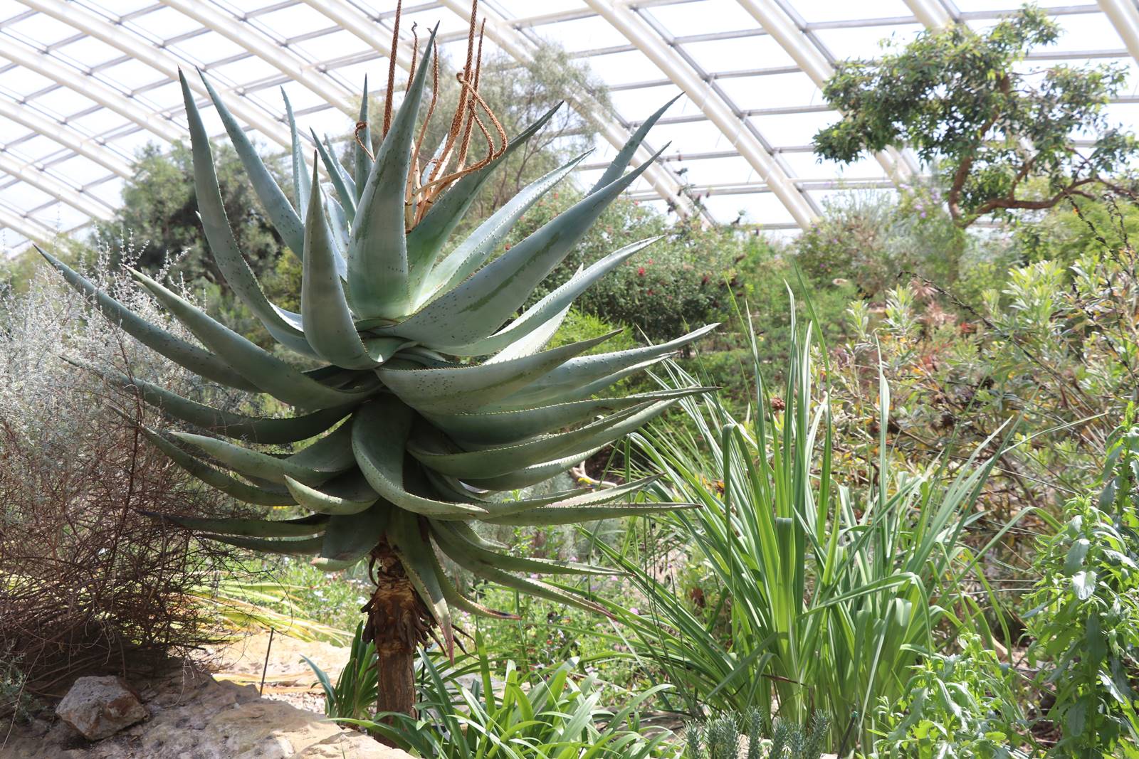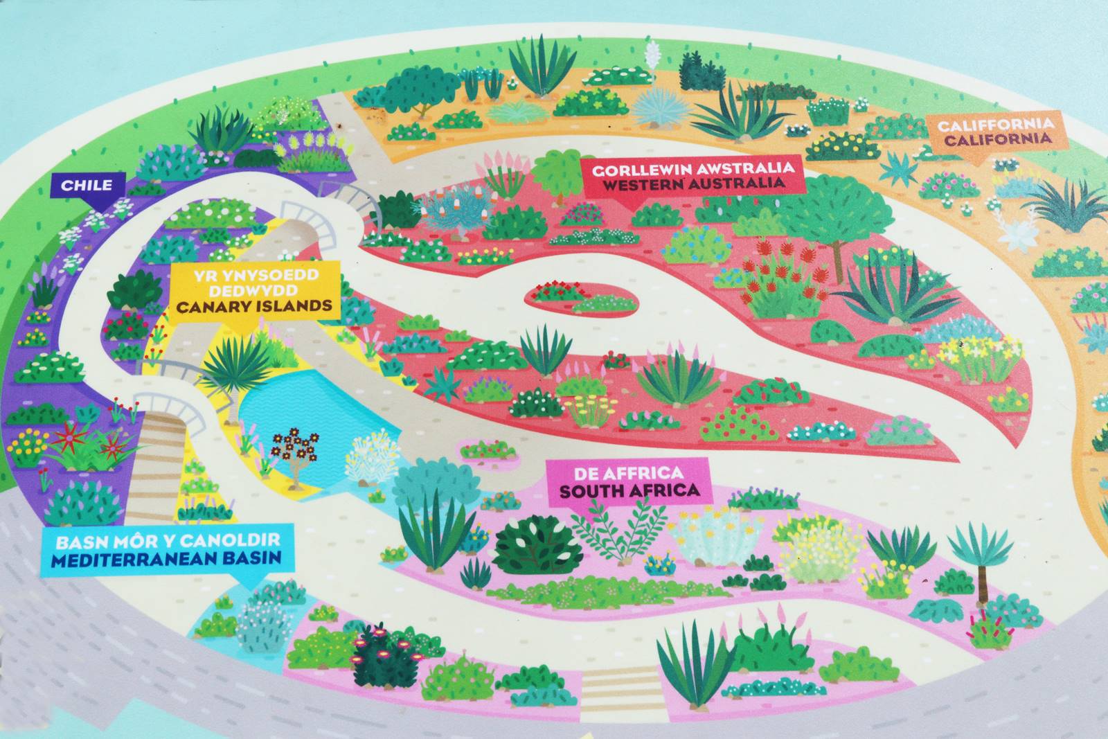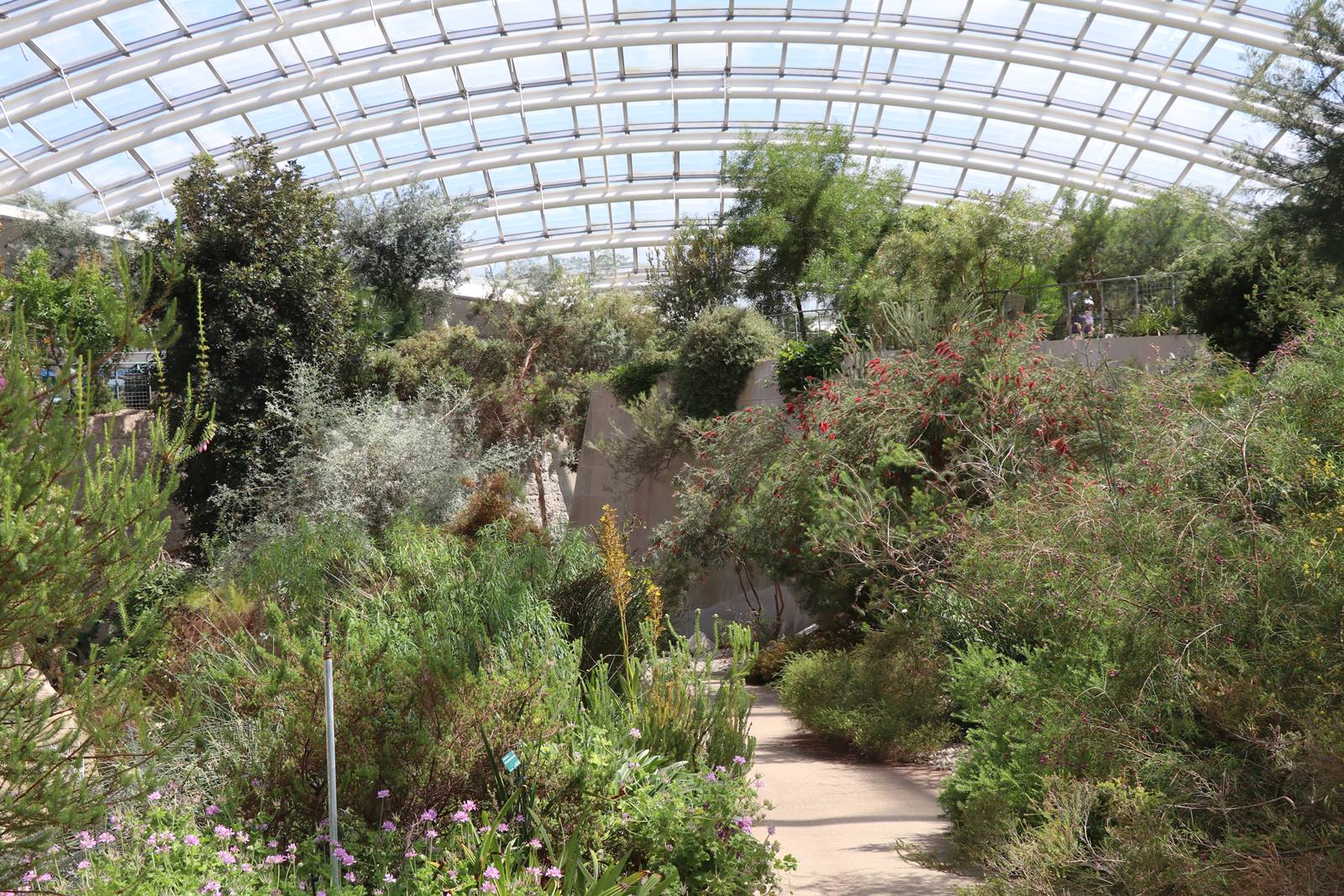 La serre tempérée du Jardin botanique national du Pays de Galles abrite des plantes les plus menacées de la planète provenant de six régions de type méditerranéen, dans le bassin méditerranéen mais aussi en Californie, îles Canaries, Chili, sud de l’Australie et Afrique du Sud. Ces régions ne couvrent que 2% de la surface de la terre mais elles abritent plus de 20% de toutes les espèces végétales du monde.
