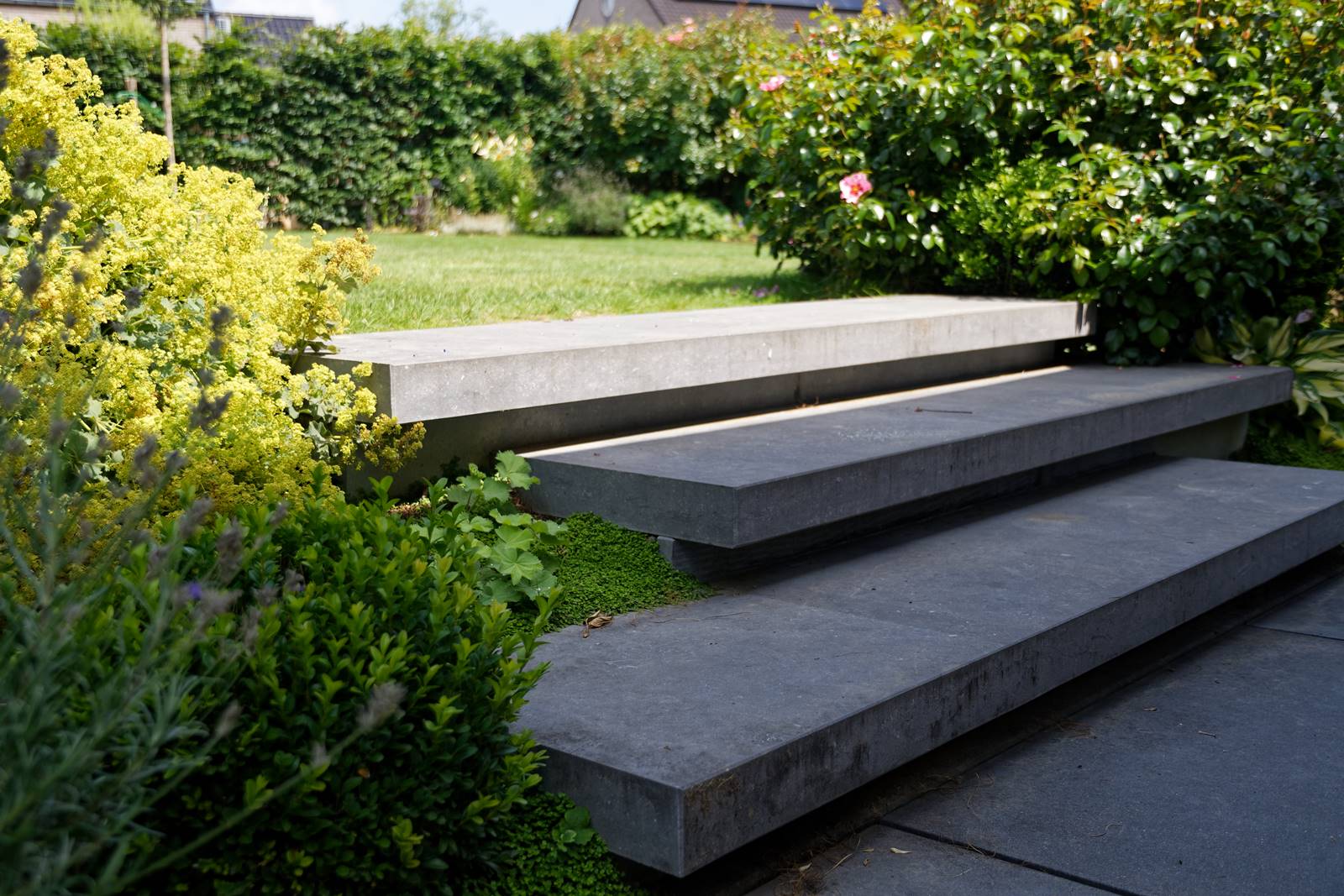 Trois marches de pierre bleue en pose flottante pour donner un petit air contemporain mènent à une seconde terrasse. Comme cette terrasse est un peu en recul dans le jardin, elle reçoit beaucoup plus de lumière que la terrasse contre la maison.