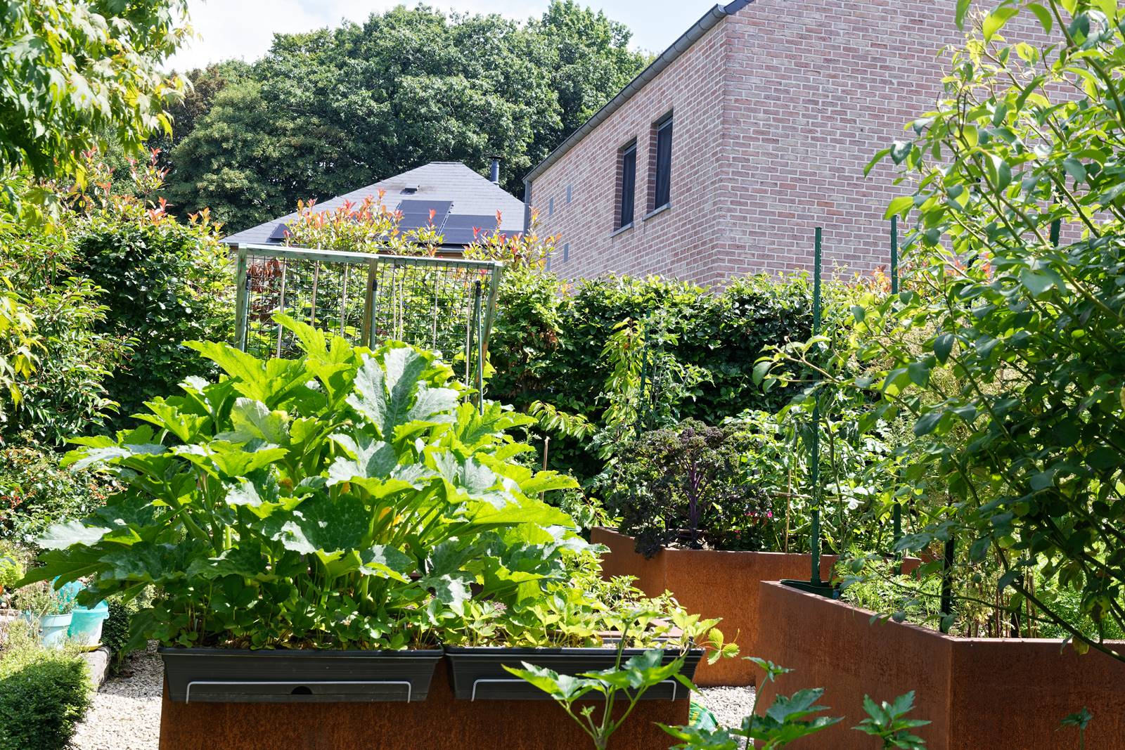 Six grands bacs carrés en acier Corten de 140×140 sur 120 cm de haut permettent de jardiner sans se baisser pour ménager son dos. Ils sont légèrement enterrés dans le sol et n’ont pas de fond ce qui facilite la circulation des vers de terre et autres micro-organismes. Le substrat est enrichi chaque année avec du compost.