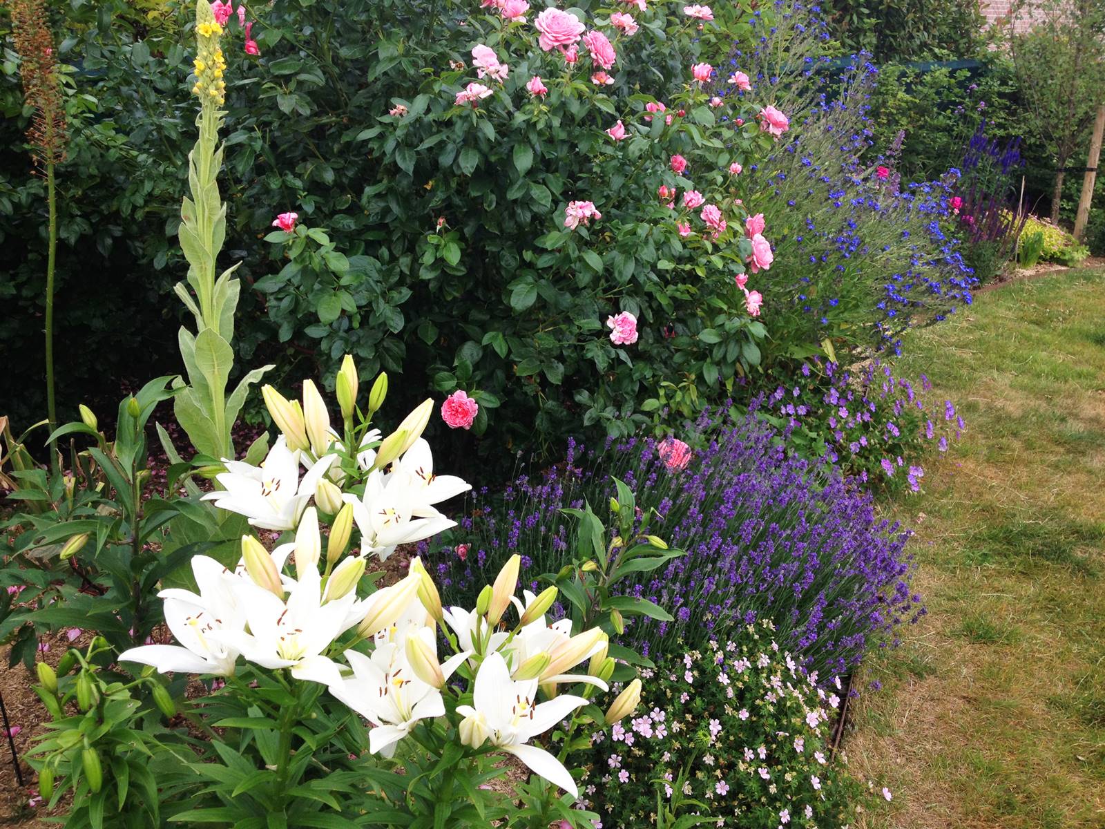 Yulia a installé des lis contre la façade. Poussant jusqu’à deux mètres, il faut les tuteurer. Par contre, les bulbes restent en terre même en hiver. Il y a aussi des dahlias qui fleurissent tard dans la saison avec les anémones du Japon. Les tubercules de dahlias sont rentrés en hiver dans le garage pour les placer à l’abri du gel.