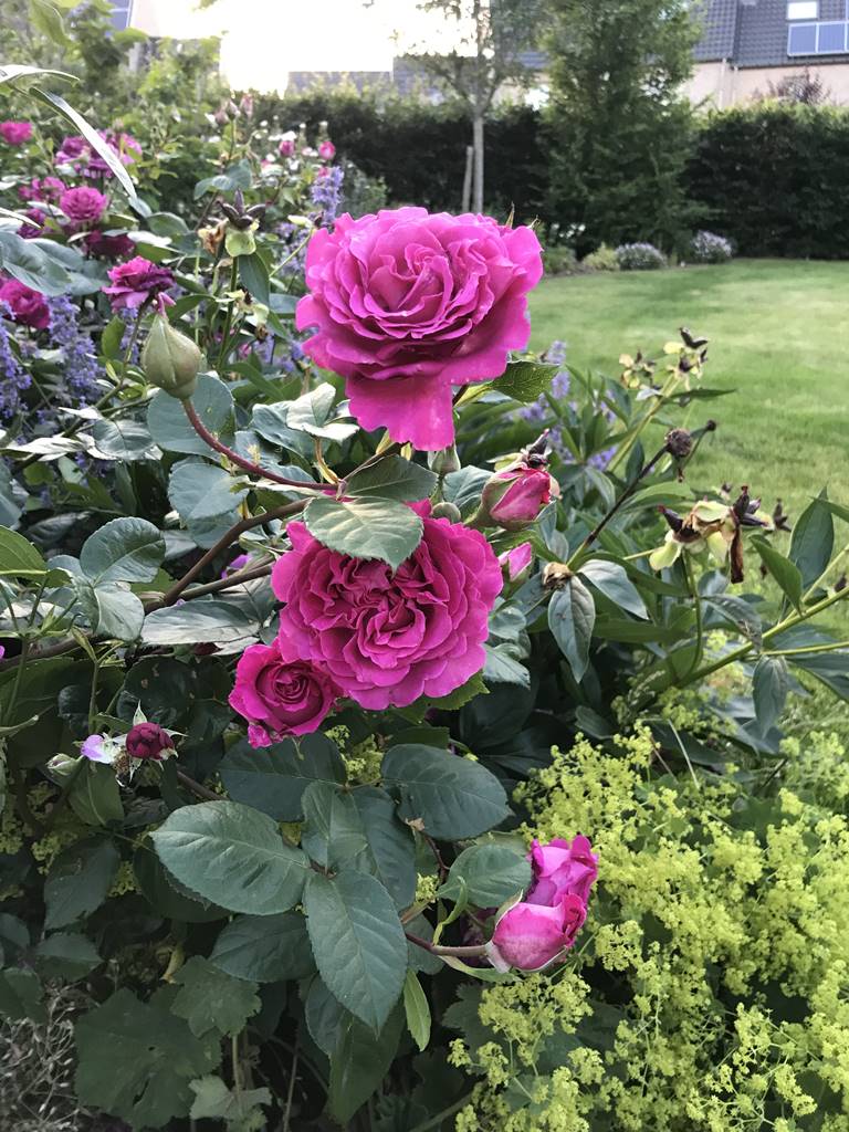 Les roses ne sont jamais seules dans le jardin. Elles ont pour compagnes des tulipes et narcisses pour le décor printanier et l’ail d’ornement qui fleurit au mois de mai juin en même temps que les alchemilles et les premières roses. En été, c’est le tour des phlox qui attirent les papillons et des coréopsis à la floraison estivale infatigable.