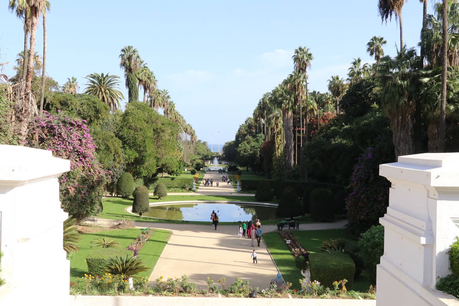 En 1914, le Jardin d’Essai du Hamma devient un jardin public destiné à la promenade. Des travaux d’embellissement et de restauration du jardin sont entrepris sous la houlette des architectes Régnier et Paul Guion à qui l’on doit la perspective des cinq terrasses du jardin à la française avec des miroirs d’eau bordés par un alignement de palmiers Washingtonia débouchant sur la Méditerranée.