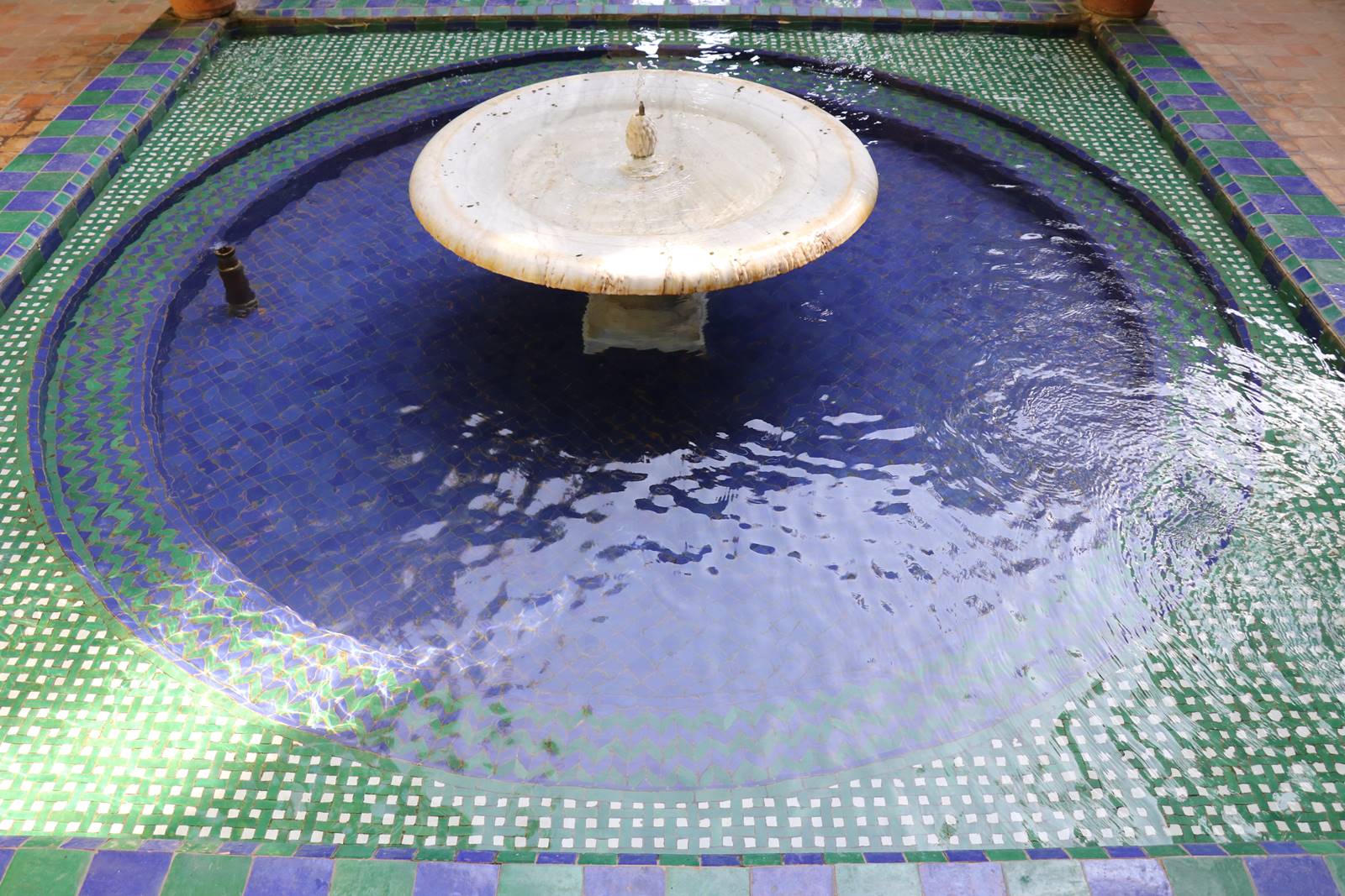 Jacques Majorelle équipe son jardin de longs et étroits cours d’eau qui convergent vers un bassin carré. La végétation, les pavillons, les kiosques et les fontaines se reflètent dans les plans d’eau, créant une dimension féerique et onirique. Les bassins et les fontaines réfléchissent aussi de la lumière sur l’ensemble du jardin. Des espaces sombres s’incisent d’éclats lumineux, dans un jeu constant d’ombre et de lumière, de miroitements et de reflets d’eau. Le bruissement de l’eau des fontaines et des rigoles apporte au jardin une note musicale, créant une ambiance d’une rare sensualité.