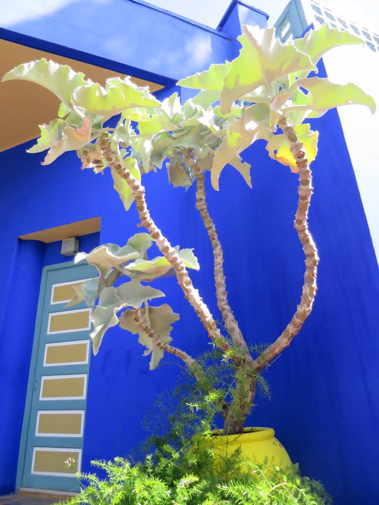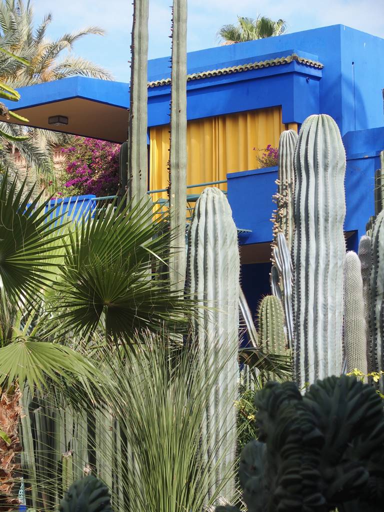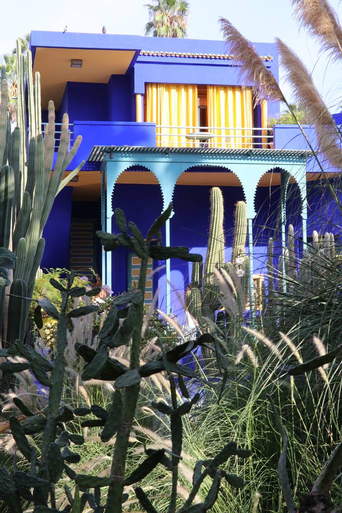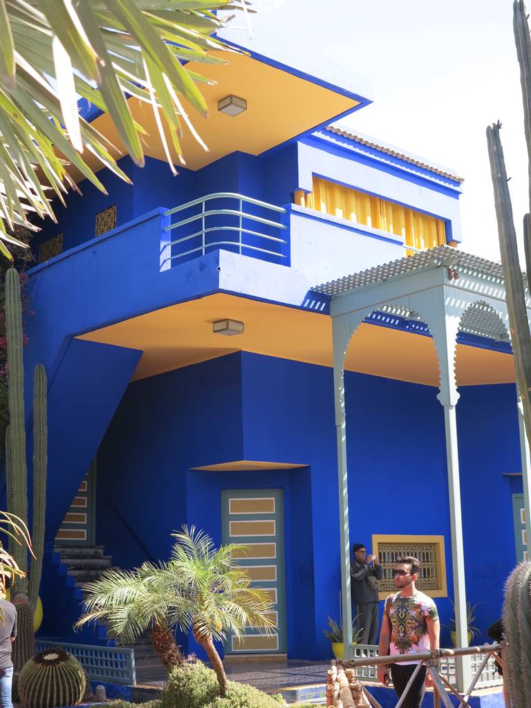 En 1937, Jacques Majorelle fait construire un atelier de peinture qui mélange l’architecture mauresque au style Art déco en vogue à cette époque. Il peint sa villa de couleurs vives dominées par un bleu vif comme une ode à la beauté envoûtante de Marrakech. Ce bleu outre-mer cobalt lumineux et intense, connu sous le nom de ‘Bleu Majorelle’, unifie l’ensemble et rehausse les autres couleurs. Majorelle l’avait admiré dans les zelliges musulmans. Il l’utilisa dans toutes les constructions du jardin.