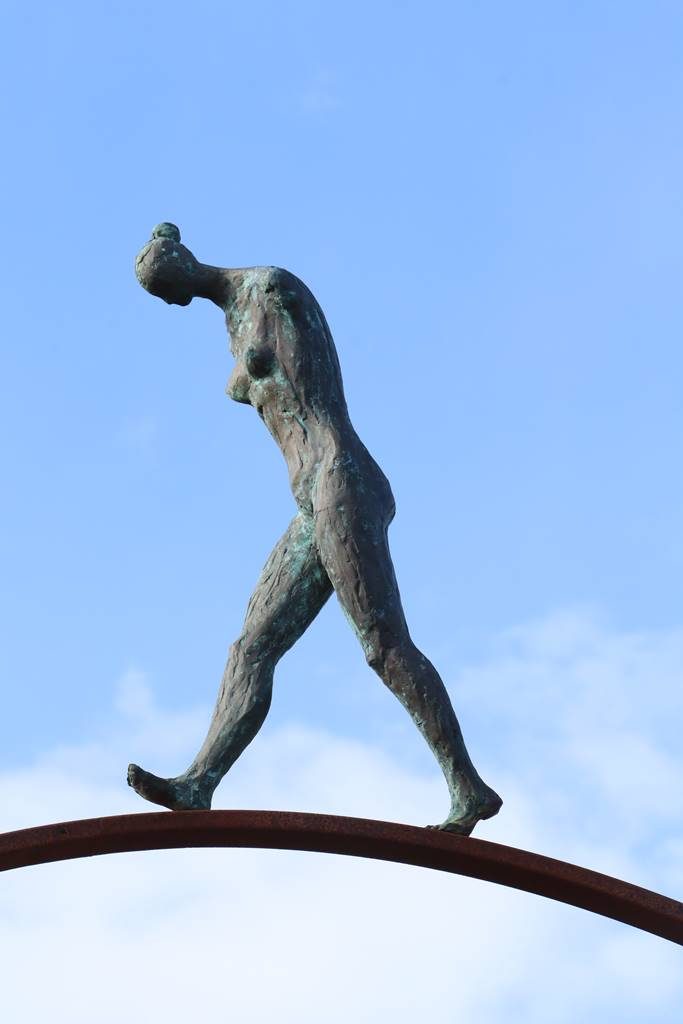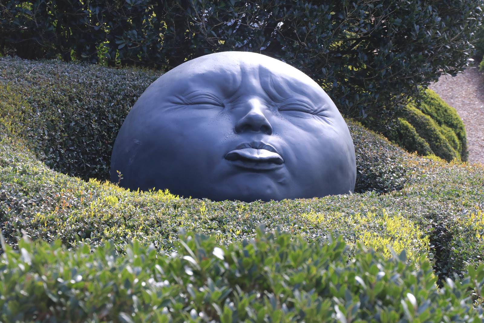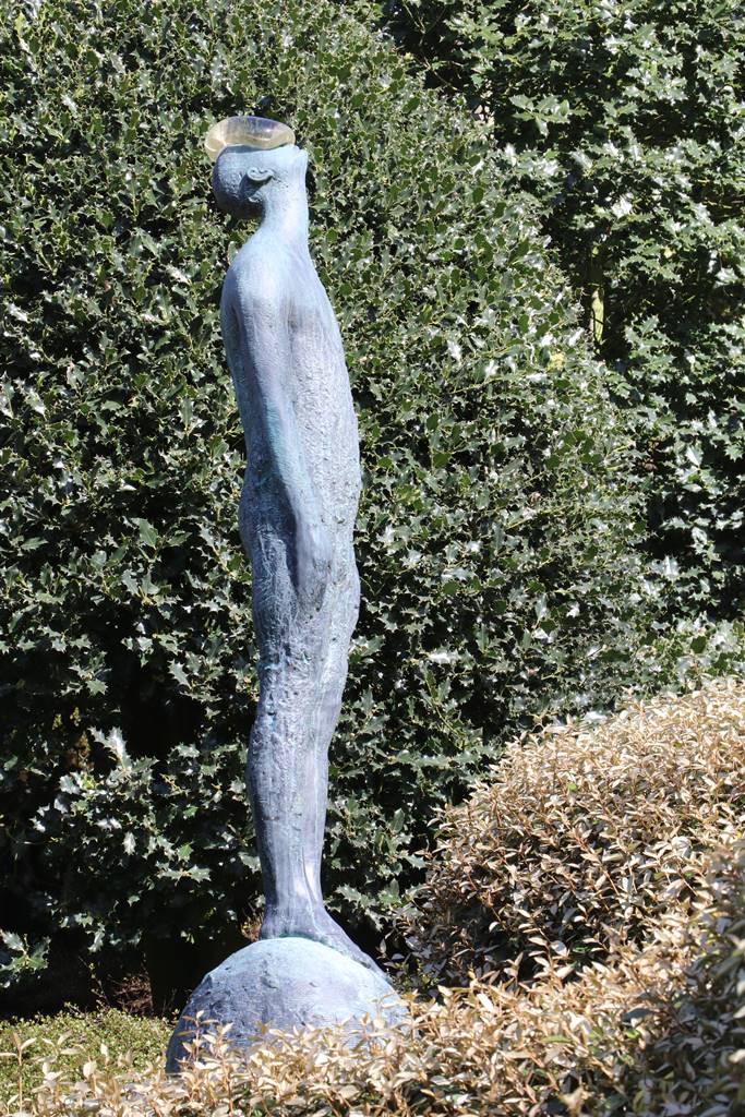 Intitulées ‘Gouttes de pluie’, ces sept sculptures en résine polyester et poudre d’aluminium ont été réalisées en 2016 pour le jardin. L’artiste a saisi et immortalisé les expressions les plus imprévisibles, telles que l’attente d’un baiser ou la contrariété qui se devine dans une moue des lèvres, l’épuisement, la douleur ou le plaisir. L’interprétation de chacun de ces visages ronds et chauves dépend avant tout du regard du spectateur. Posés comme une goutte d’eau ou une perle rare dans un coquillage symbolisé par une collerette moutonnante de verdure, ces visages sont époustouflants!