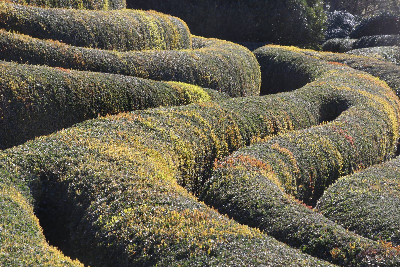 Les jardins utilisent un nombre restreint de végétaux au feuillage persistant propices à la taille, des Taxus, Osmanthus, Buxus sempervirens, Ligustrum delavayanum, Phillyrea angustifolia, Ilex aquifolium, Enkianthus perulatus japonicus, Muehlenbeckia compactus et complexa. Peu de fleurs dans ce jardin si ce n’est au printemps l’éclosion des camélias, rhododendrons et azalées.