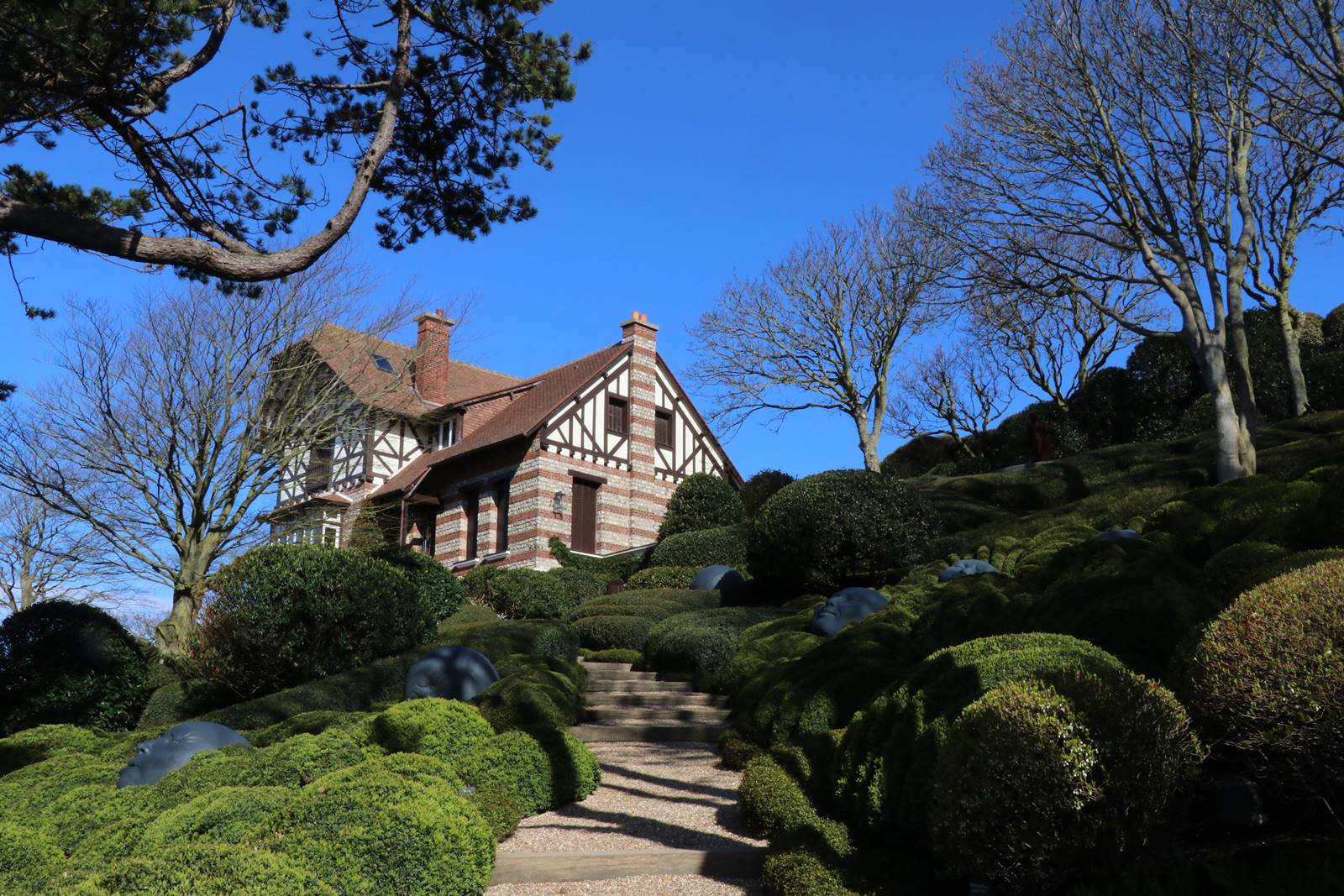 Les sculptures végétales qui assurent aux jardins leur beauté tout au long de l’année évoquent les falaises et les arcs de la Côte d’Albâtre qui lui font face. Le visiteur s’y perd comme s’il nageait dans les vagues de la Manche, happé dans un tourbillon de formes qui, comme des sirènes, le bercent et l’envoûtent.