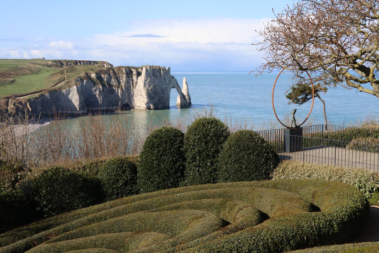 Un peu plus haut, le jardin de la Manche est le coeur des Jardins d’Etretat. Il est formé d’un labyrinthe massif de plantes taillées à la manière de vagues déferlantes, de spirales et tourbillons marins. La couleur argentée des feuillages rappelle celle de l’écume des vagues qui s’écrasent contre les falaises d’Etretat.