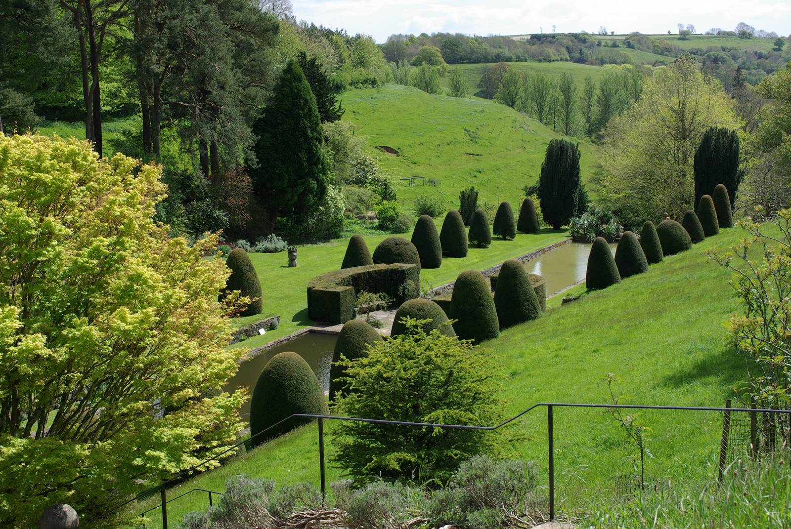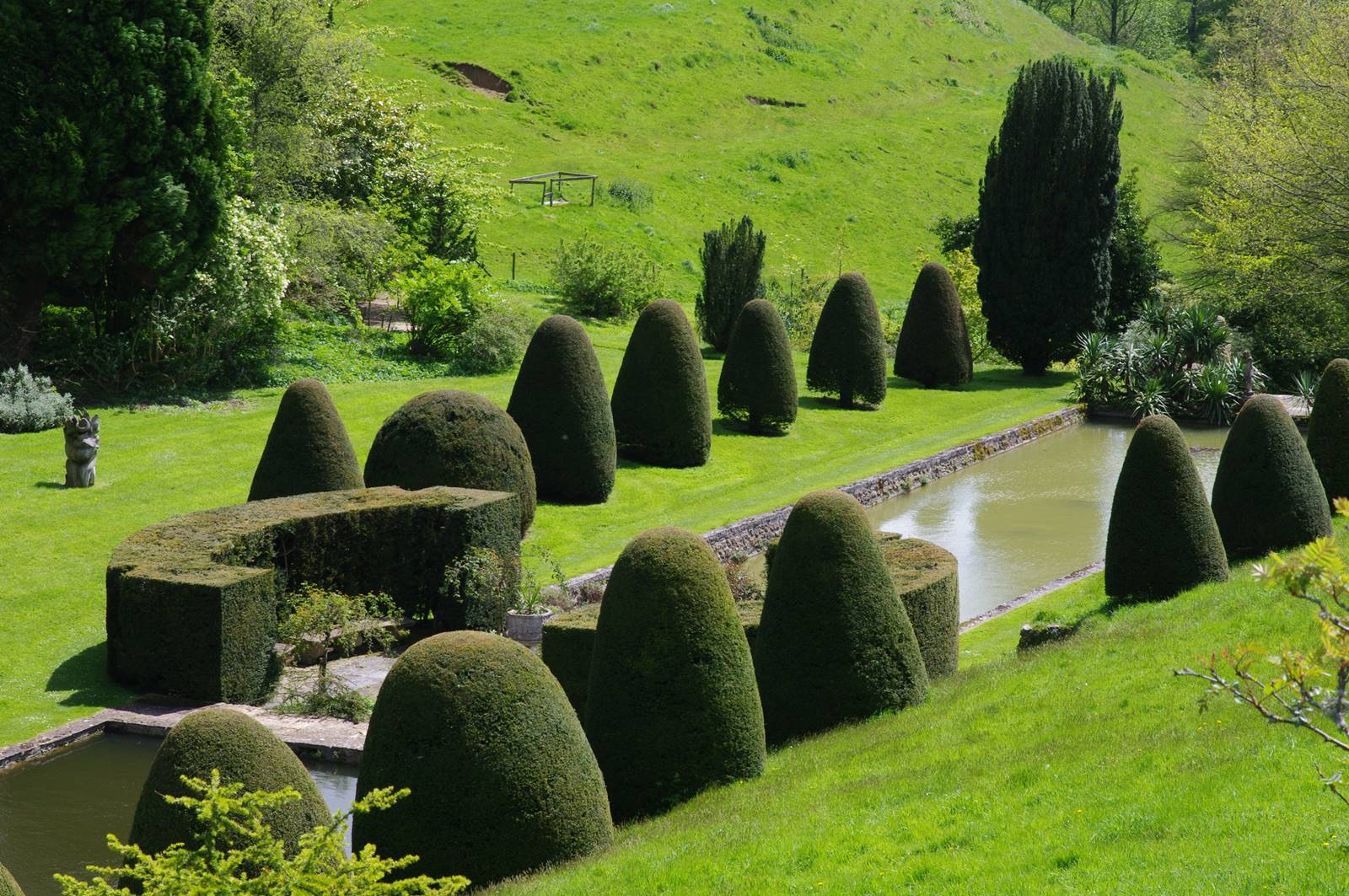 Le jardin se prolonge en contrebas par deux longs bassins rectangulaires encadrés de cônes d’ifs et animés par des statues animalières. Au bout des bassins se dresse une Summer House du 17e siècle. Ce jardin contraste avec beaucoup d’élégance et de caractère avec les prairies qui l’entourent.