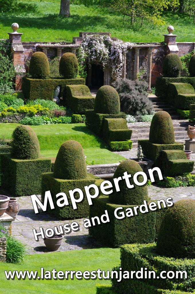 Le manoir de Mapperton domine des jardins terrasses. Sur les hauteurs se situe la demeure dont la cour intérieure accueille un parterre peuplé de roses, de camélias et de clématites. Entourée d’un muret de pierre grise de Portland et épaulée par un petit pavillon, une vaste pelouse de croquet, le Croquet lawn, est bordée d’un parterre planté d’un mélange d’arbustes et de magnolias.