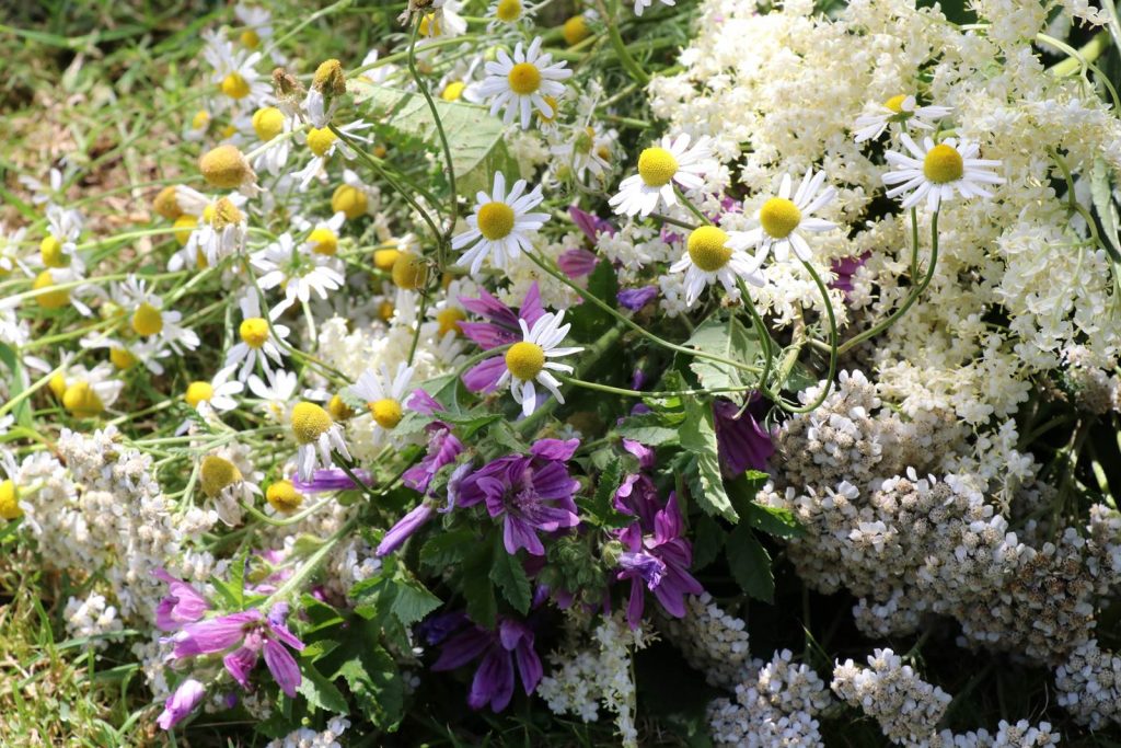 Les herbes guérisseuses cueillies au coeur du solstice d’été offrent un bouquet de vertus. Il faut idéalement les récolter avant que la rosée de la nuit ne soit évaporée. Elles sont nombreuses et différentes selon les régions. Il y a l’achillée millefeuille (cicatrisant), le sureau (laxatif), le lierre (pulmonaire, calme la toux), le plantain (cicatrisant, anti-allergique et anti-inflammatoire), les feuilles du frêne (rhumatismes et goutte), le millepertuis (rhume), la valériane (tranquillisant), la fougère (vermifuge et purgative), l’armoise (refroidissements et douleurs abdominales) et la verveine (tonique et anti-spasmodique). On les utilise en sirops ou cataplasmes, mais avec prudence car certaines substances peuvent être toxiques. (voir mon reportage sur les plantes sauvages comestibles, sur les plantes toxiques, sur un stage d’herboristerie et les recettes de santé d’Hildegarde)