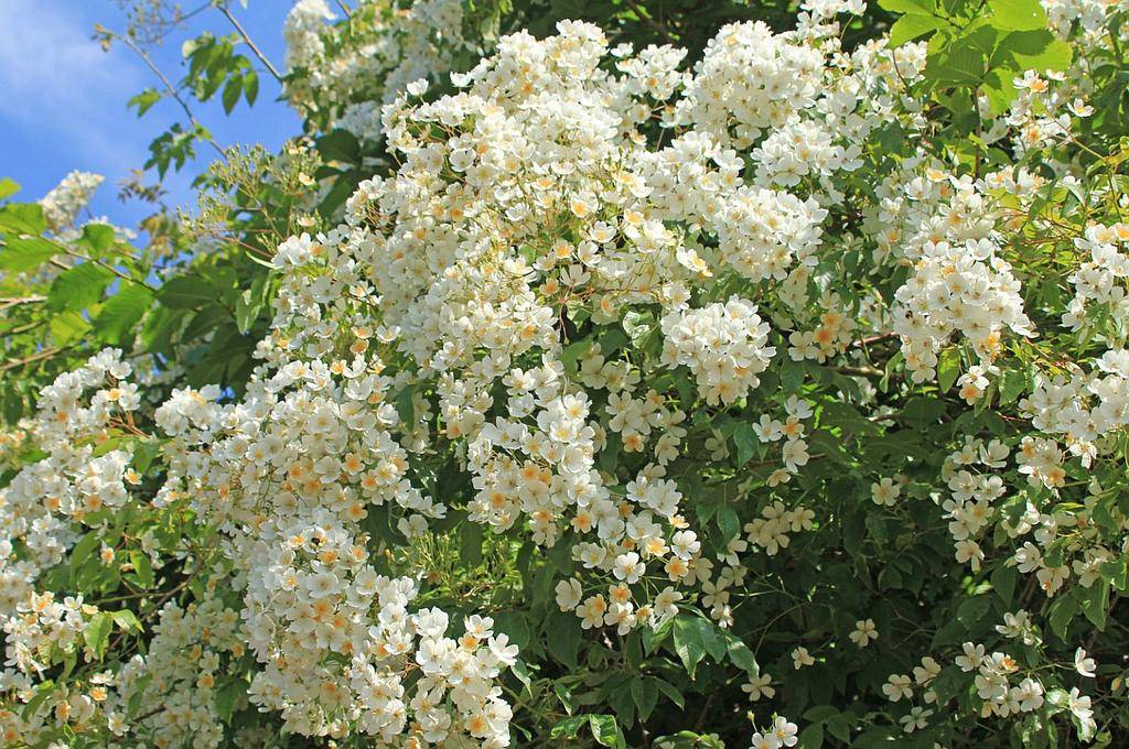 Un rosier liane spectaculaire planté en 1938 par Heather Muir porte le nom du domaine, Rosa filipes ‘Kiftsgate’. Elle l’avait acheté dans la pépinière de E.A. Bunyard, pensant qu’il s’agissait d’une Rosa moschata. En 1951, l’expert Graham Stuart Thomas qui visite Kiftsgate l’identifie comme une forme vigoureuse de Rosa filipes. Le rosier croule au mois de juillet sous une avalanche d’églantines blanches parfumées qui produisent en automne des petits fruits rouges. Grimpant à l’assaut d’un hêtre à près de 20 mètres de haut sur 25 mètres de large, ce rosier serait l’un des plus grands specimen de Grande-Bretagne.