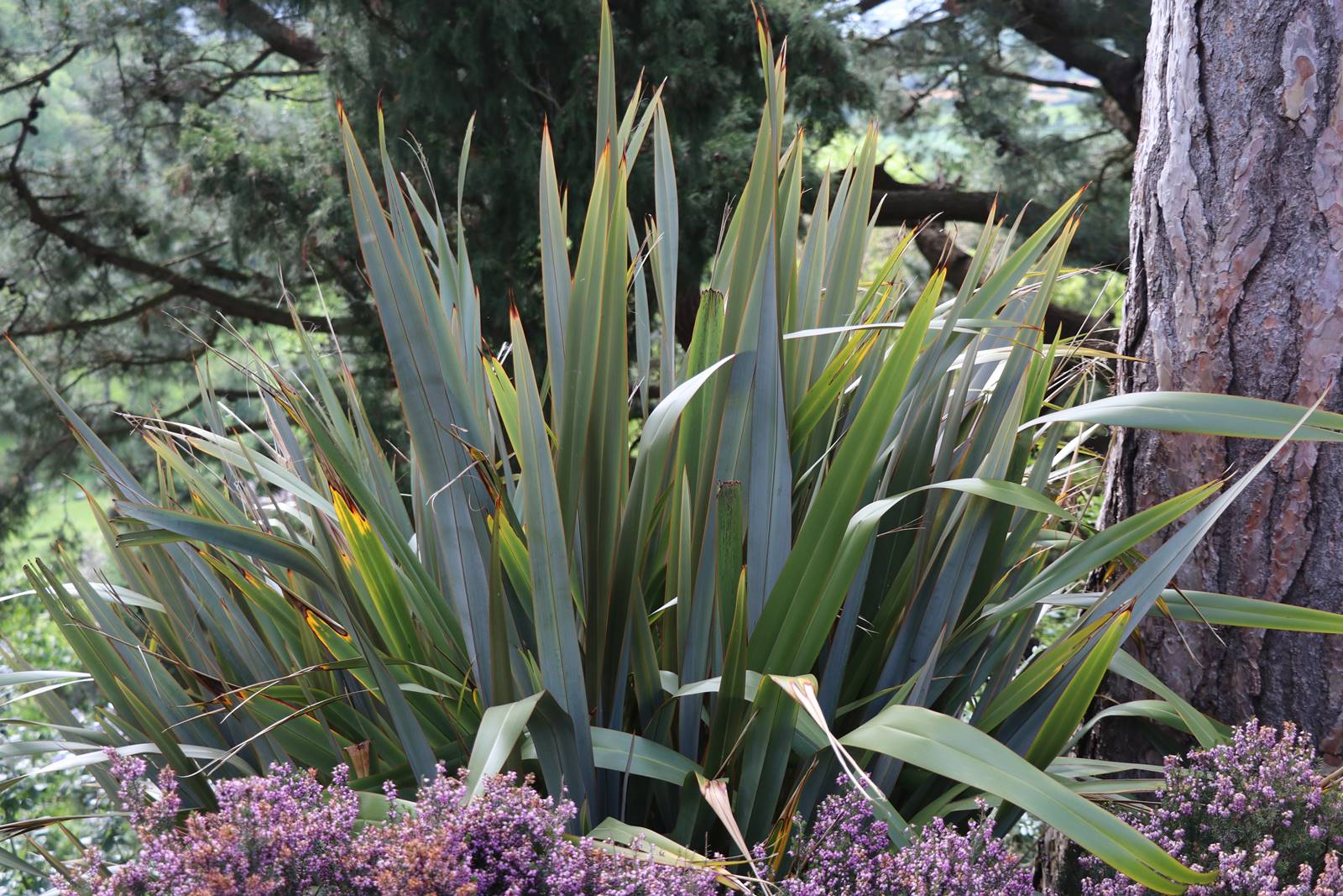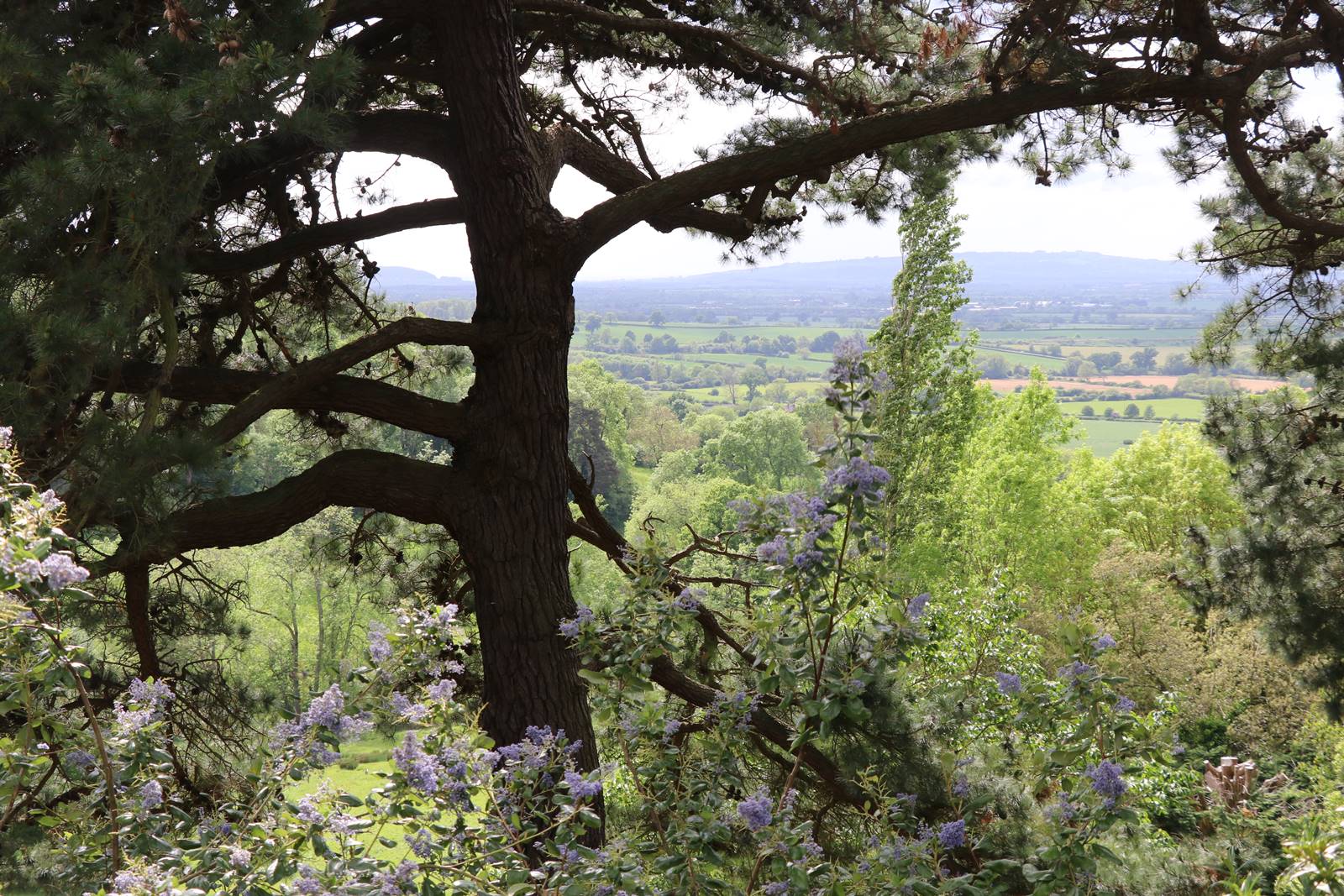 Le manoir de Kiftsgate surplombe un grand talus couvert de Pinus radiata, pins de Monterey. La piscine située en bas de la colline est implantée dans une sorte de micro-climat où poussent de nombreux arbustes réputés gélifs et plantes méditerranéennes, abutilon, ciste, romarin, phormium, pittosporum, céanothus et palmiers de Chine, Trachycarpus fortunei.