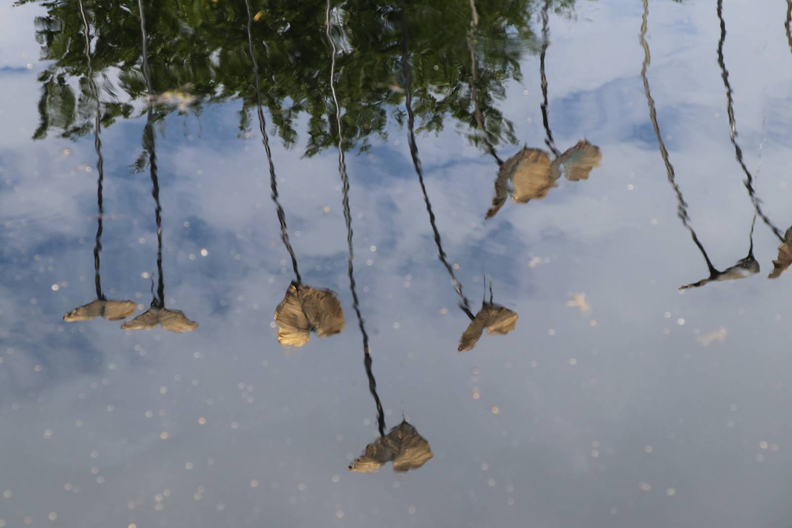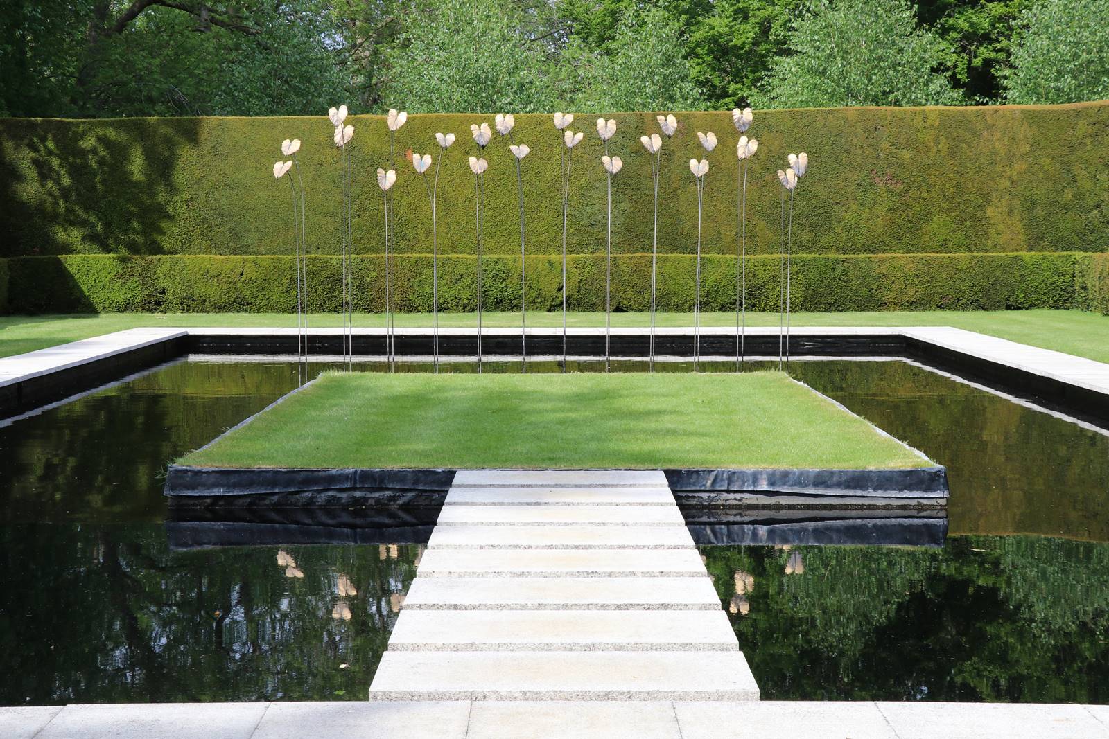 Cet ensemble est complété par une installation de l’artiste Simon Allison. Des feuilles en bronze doré de philodendron dressées sur tige flottent au dessus de l’eau offrant un léger mouvement au vent. Un fin jet d’eau s’écoule de chaque feuille. Superbe!