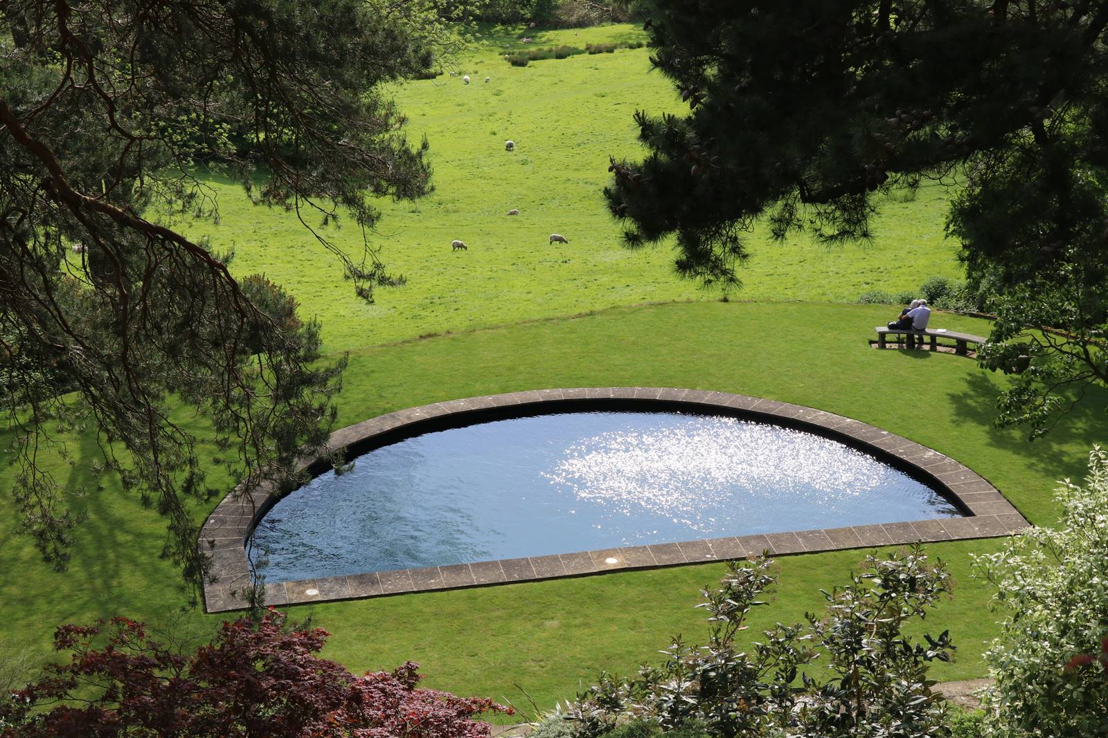 L’une des réalisations les plus audacieuses d’Anne Chambers est la transformation de l’ancien terrain de tennis en un miroir d’eau de style contemporain. Le bassin rectangulaire rempli d’une eau couleur d’encre est entouré de dalles blanches qui mènent à un îlot herbeux au centre du bassin.