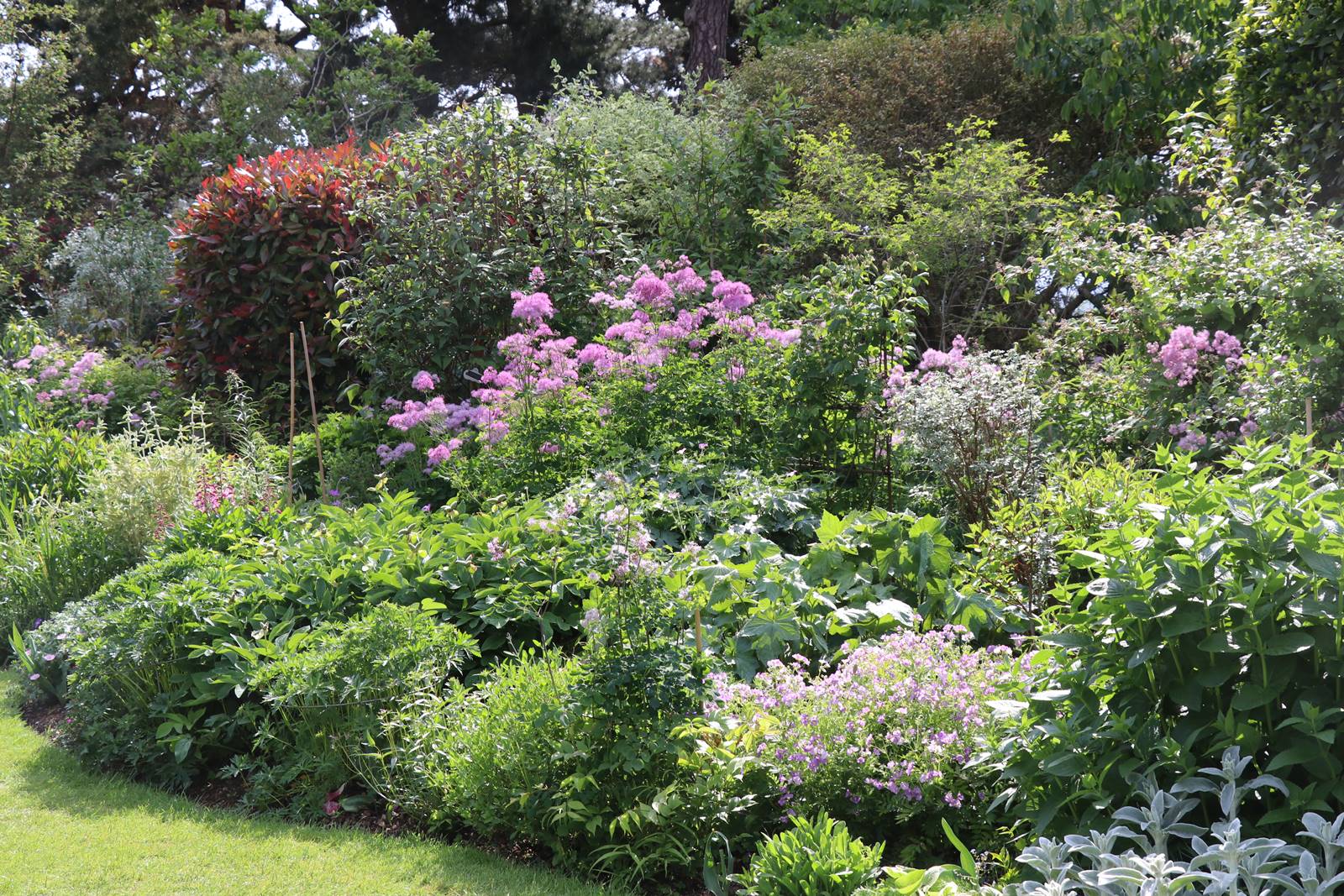 De part et d’autre d’un chemin d’herbe s’étend une double bordure plantée d’un mélange d’arbustes, de petits arbres et de plantes herbacées que l’on encourage à s’épandre librement sur les pelouses et les sentiers. Plus loin, le jardin de roses mêle des rosiers botaniques, roses anciennes et modernes agrémenté de plantes vivaces et de graminées.
