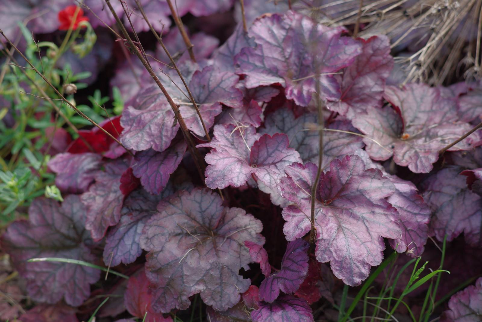 En haut Sedum ‘Purple Emperor’, chou, Ophiopogon planiscapus ‘Nigrescens’, Heuchera et Imperata cylindrica