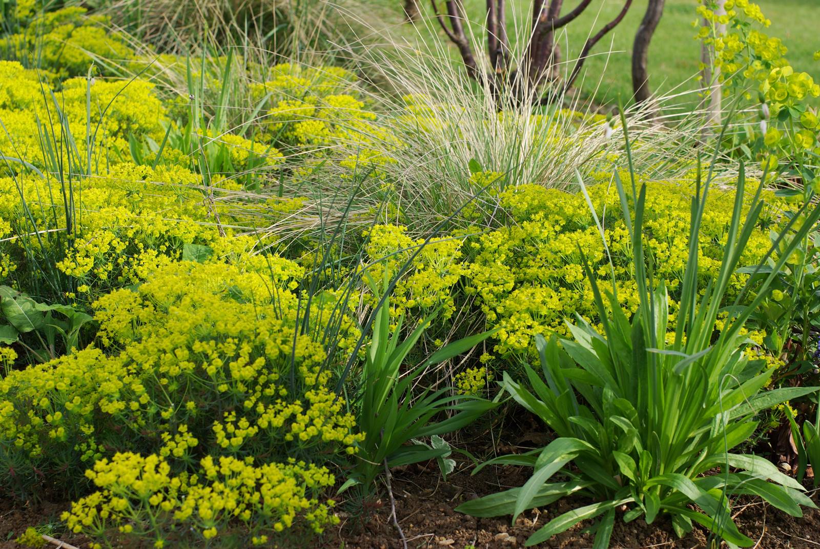 Le vert est un mélange de jaune et de bleu. Dans un jardin, un fond de feuillages verts tempère la violence des couleurs primaires.