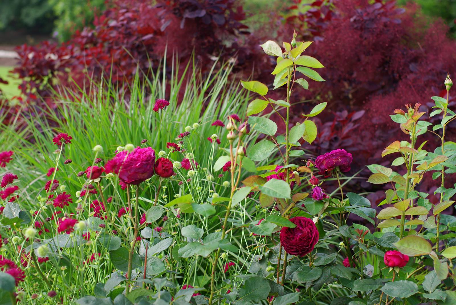En haut Rose et Lythrum salicaria, Rose ‘Munstead Wood’, Rhododendron et Bruyères, Rose ‘Rhapsody in Blue’