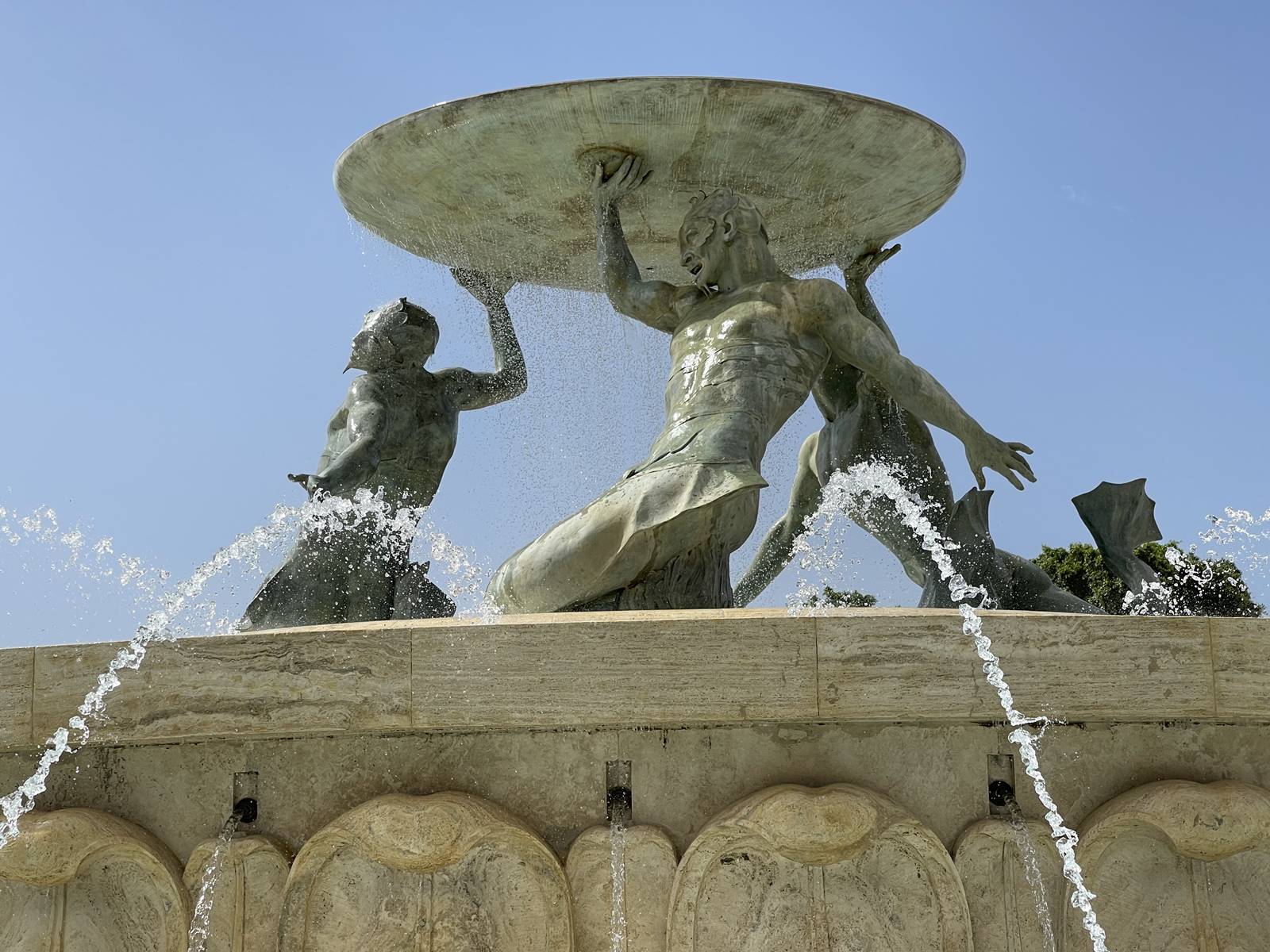 En contrebas des remparts, à l’entrée de la cité historique de La Valette, la Fontaine aux Tritons est le premier monument que le touriste découvre installé au centre d’une grande esplanade piétonne. Trois tritons en bronze, dieux de la mer, regardent vers l’entrée de la cité.