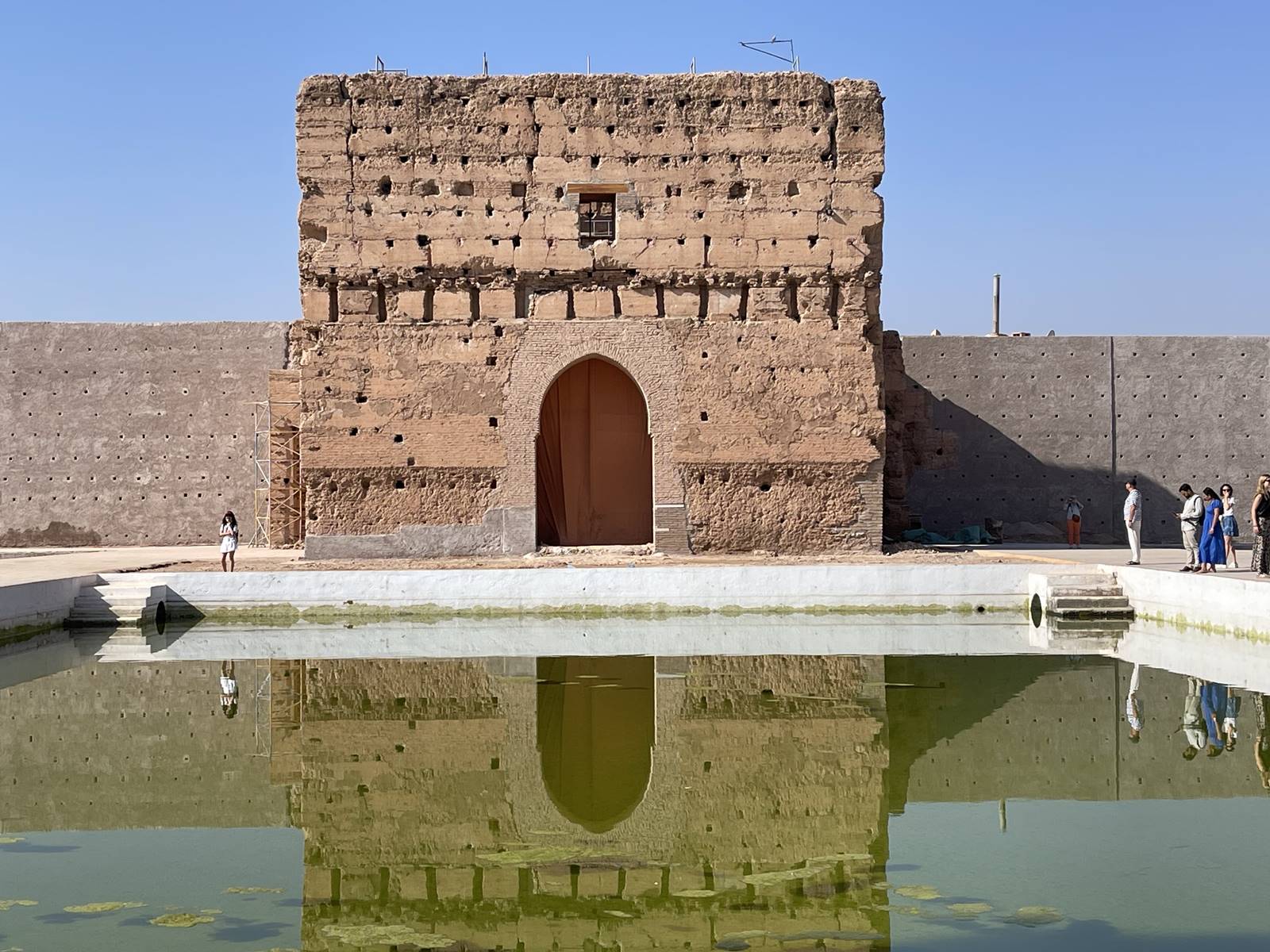 Hélas, rien n’a subsisté du faste du palais Badi. Il ne reste que des murs en pisé autour d’une immense cour, les ruines massives d’anciens pavillons et le tracé géométrique des vastes bassins et des parterres plantés d’orangers, de citronniers et cédratiers. Une série de salles souterraines abritait les esclaves et les serviteurs. C’est un exemple remarquable de l’architecture domestique saâdienne. (voir mon reportage sur le Palais Badi)