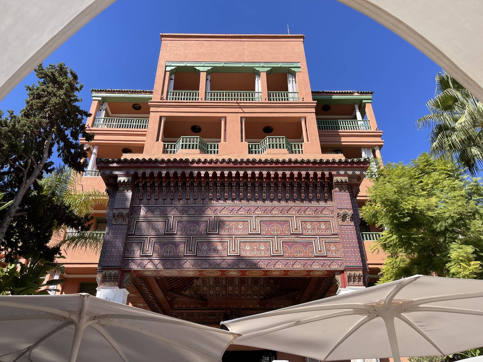 En 1923, la Mamounia est transformée en hôtel de luxe, un des plus beaux palaces au monde. Les jardins qui s’étendent sur 8 hectares ont gardé leur caractère d’origine avec de grands carrés de vergers plantés de palmiers, d’oliviers, d’orangers, de pamplemoussiers, de citronniers, de grenadiers, de figuiers et de mûriers. L’équilibre entre l’élément minéral et végétal, les esplanades et terrasses au sol couvert de zelliges, les fontaines et les ruisseaux, tout est idyllique. (voir mon reportage sur la Mamounia)