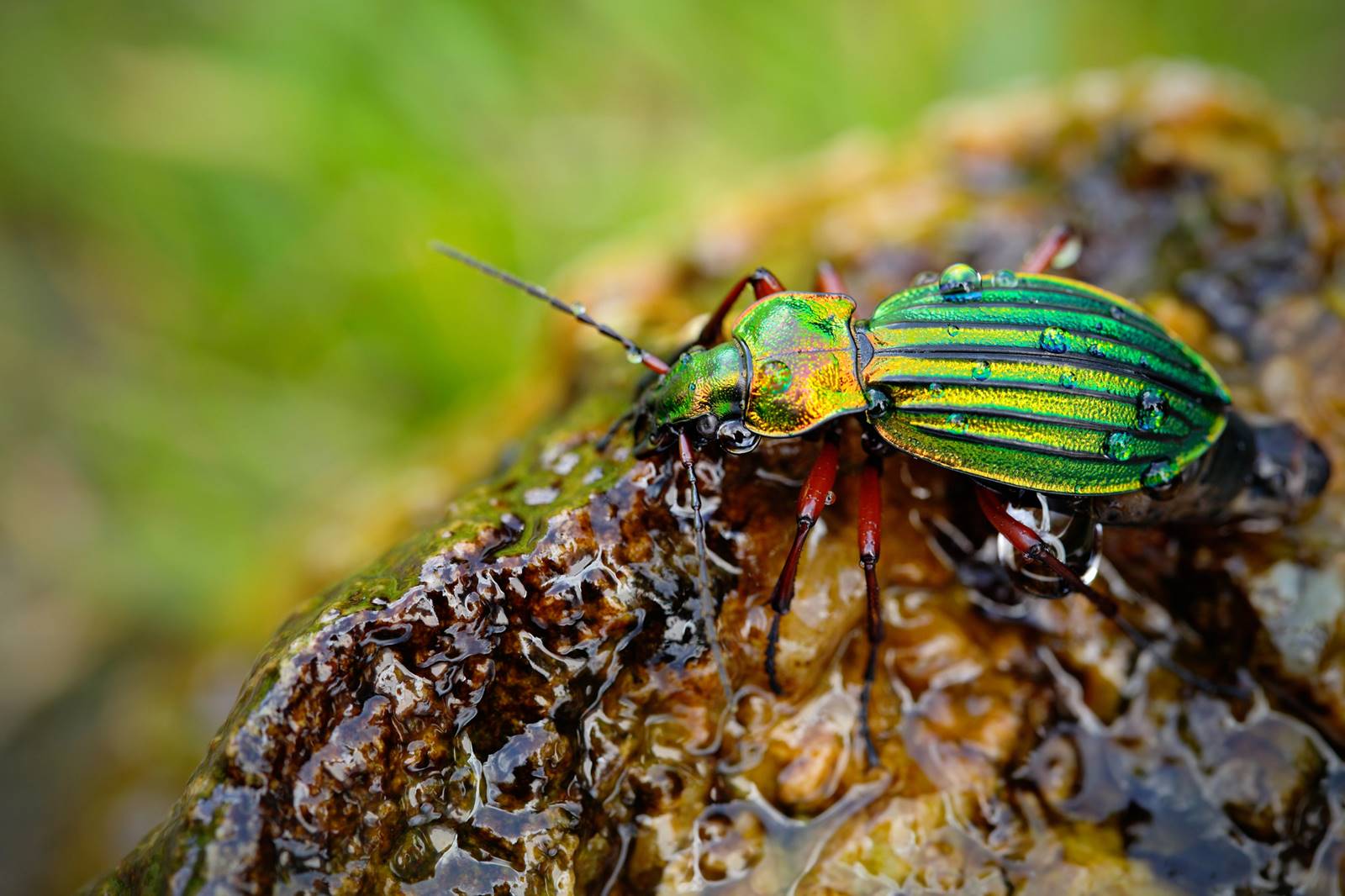 Connu sous le surnom de ‘jardinière’, le carabe doré est un des plus beaux coléoptères. Ses élytres et son thorax sont verts avec des reflets métalliques. Ses ailes étant rudimentaires, il ne peut pas voler. Il se déplace au sol grâce à ses six pattes qui lui permettent de grimper partout. Il vit dans les jardins ou les forêts, dans les haies, sous les branchages et sous les pierres. Ses puissantes mandibules lui permettent de broyer sa nourriture, larves, chenilles, limaces, doryphores, pucerons et vers de terre. Il consomme également les graines de mauvaises herbes, limitant leur développement. On favorise sa présence au jardin en laissant une bande d’herbe sans fauche. On peut aussi lui offrir un pot empli de paille sèche ou un fagot de brindilles dans une caissette où il pourra se réfugier.