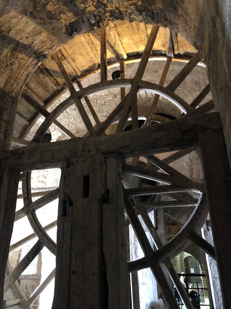 Par un petit passage, on pénètre dans l’ancien ossuaire des moines soutenu par trois rangées de piliers. Une énorme roue a été installée en 1818 afin de monter la nourriture des détenues qui étaient alors enfermés dans l’abbaye transformée en prison. C’est une réplique des roues utilisées au Moyen-Age pour les chantiers de construction.