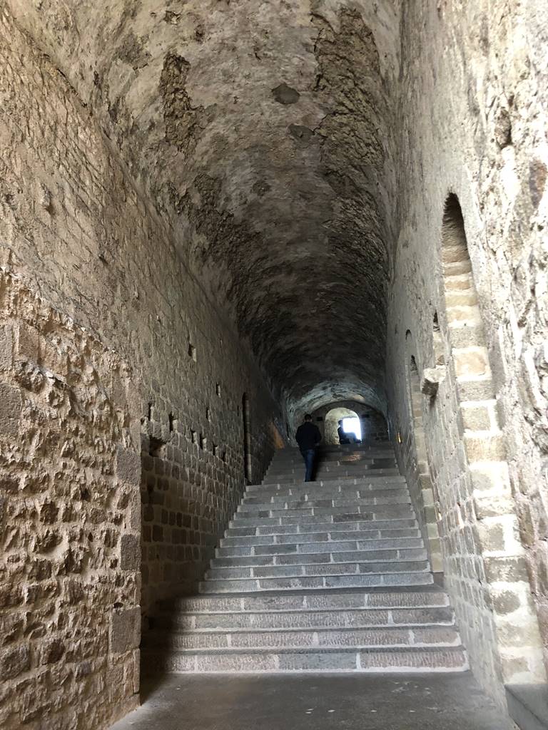 Datant du 11e siècle, l’escalier nord-sud est le plus grand axe de circulation du monastère roman. Il est couvert d’une longue voûte en berceau plein cintre. La voûte ne suit pas l’inclinaison des marches mais il reste toujours au même niveau. A droite en montant, une porte donne accès à l’église pré-romane que l’on ne peut visiter que dans le cadre de visites-conférences.