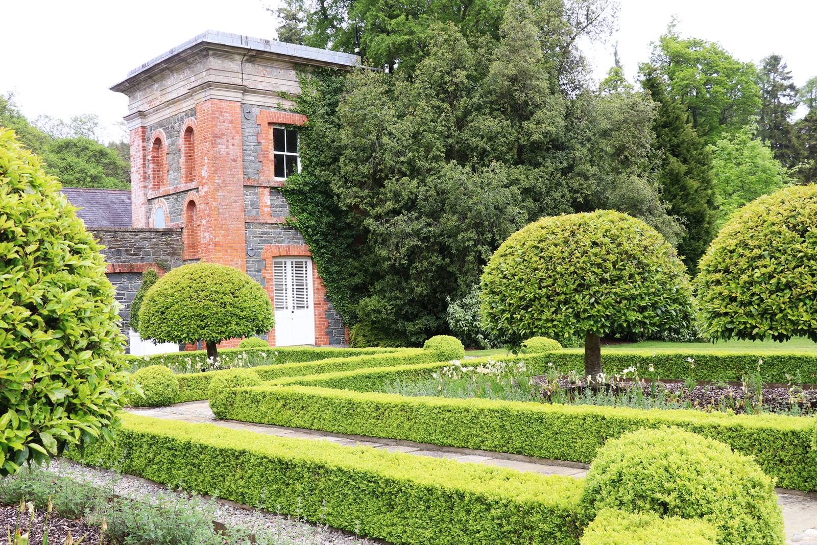 Installé près du manoir, le jardin formel domine le lac de Montalto. Il assemble six grands parterres aux formes géométriques soulignés de bordures de Buxus sempervirens et de Prunus lusitanica taillés en topiaires. Au printemps, les plates-bandes sont colorées de tulipes ‘Spring Green’ aux élégantes corolles couleur crème veiné de vert.