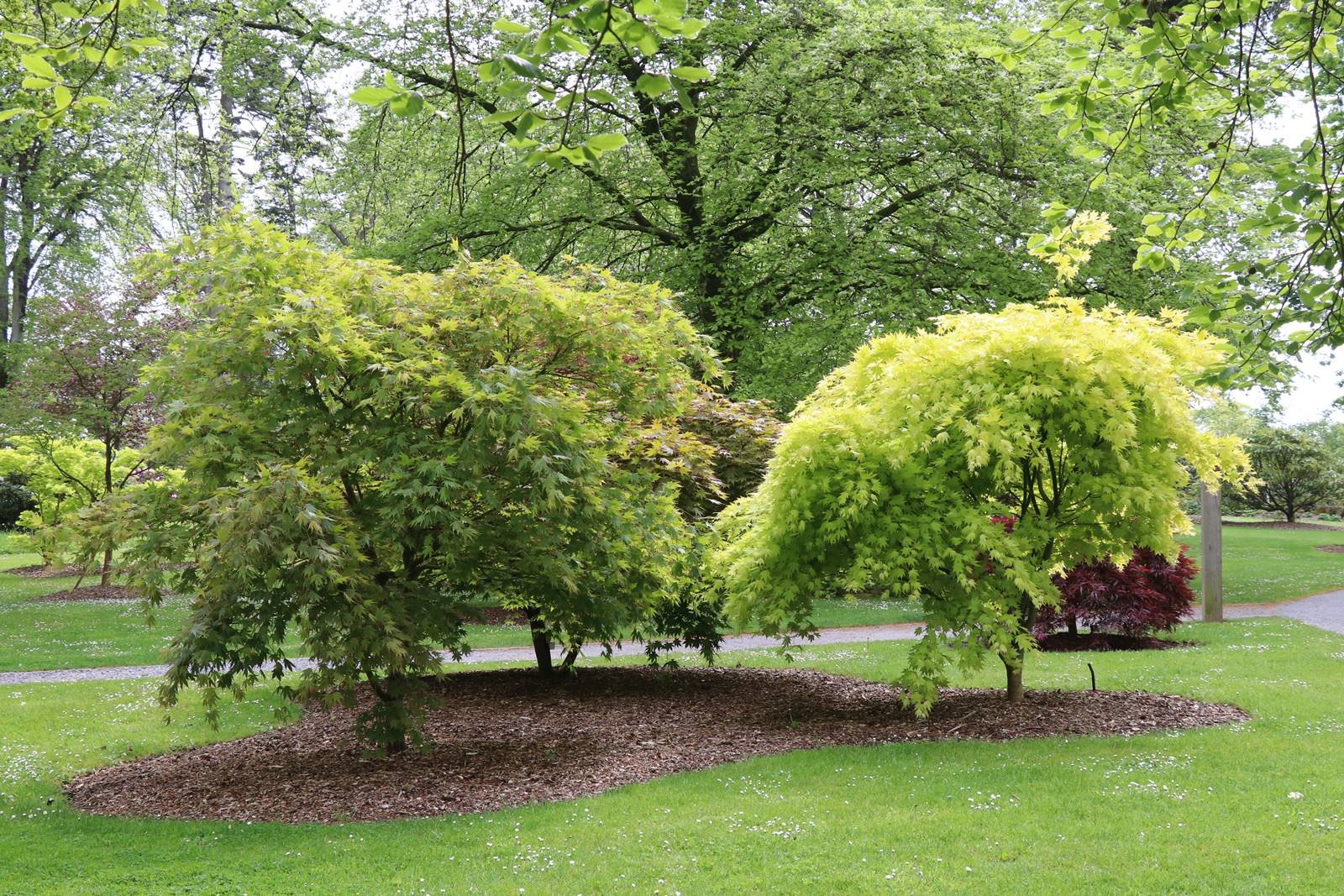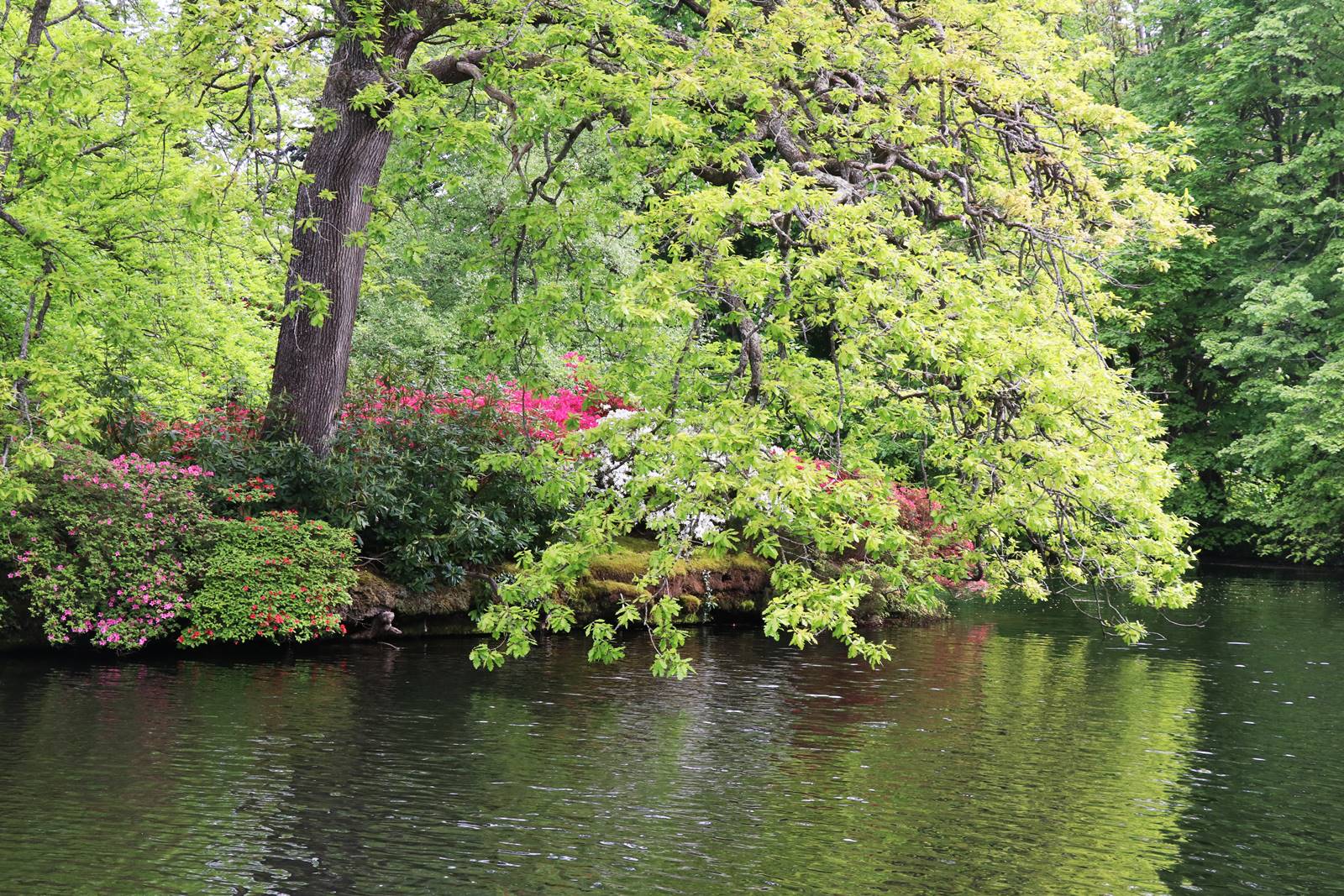 Les chemins qui sillonnent le parc sont bordés de massifs de rhododendrons et d’azalées à feuilles caduques. Au cours des dernières années, plus de trente mille arbres ont été plantés dans le Woodland et autour du lac.