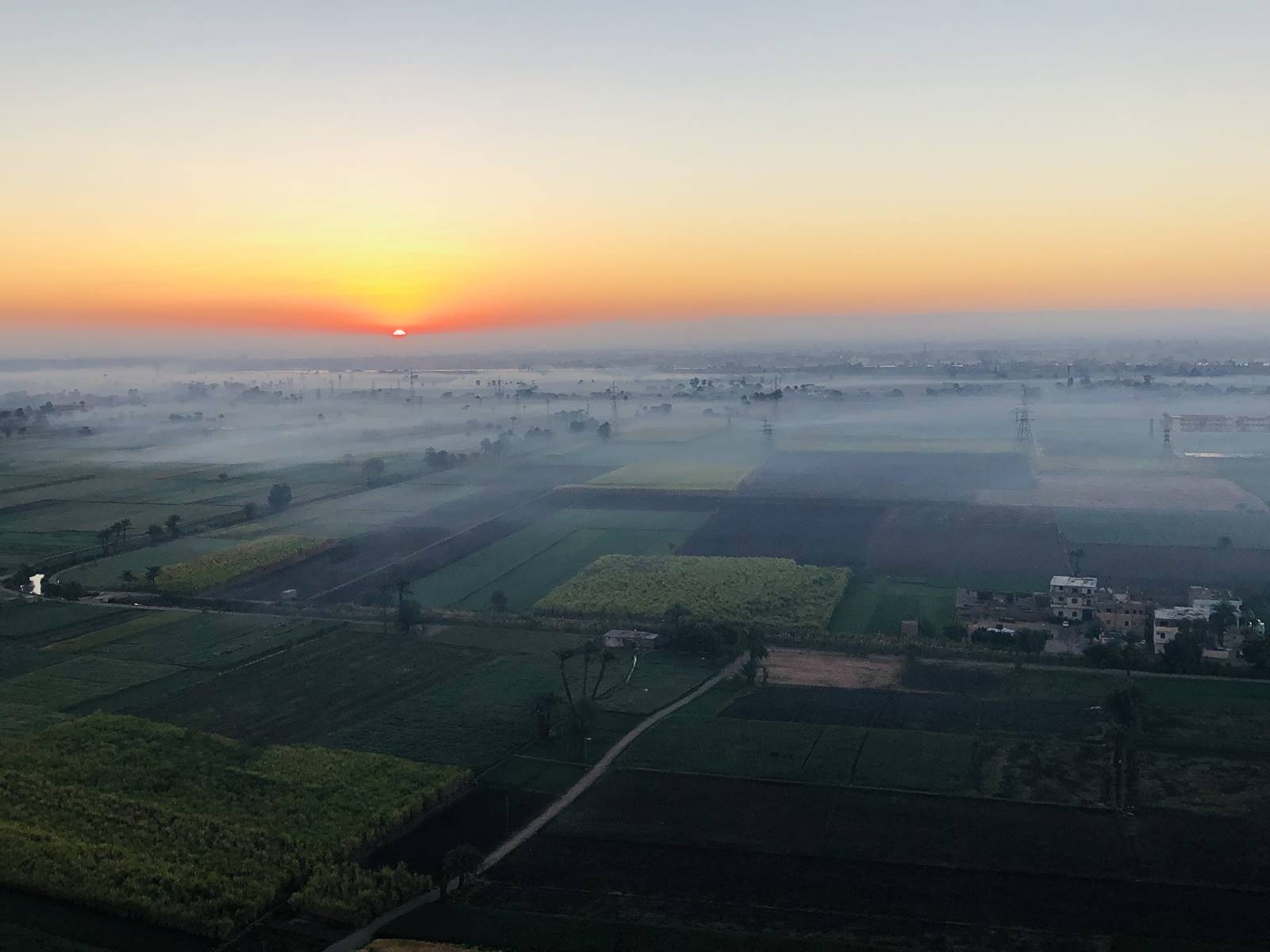 Le décollage se fait en douceur. Ca y est, on s’envole… C’est mon premier vol en montgolfière. J’ai un peu d’appréhension car j’ai le vertige mais la profondeur des nacelles est rassurante. Dans l’aube naissante, on prend rapidement de la hauteur grâce aux brûleurs qui nous réchauffent et alimentent en air chaud le ballon. La vallée thébaine se dévoile dans la brume.