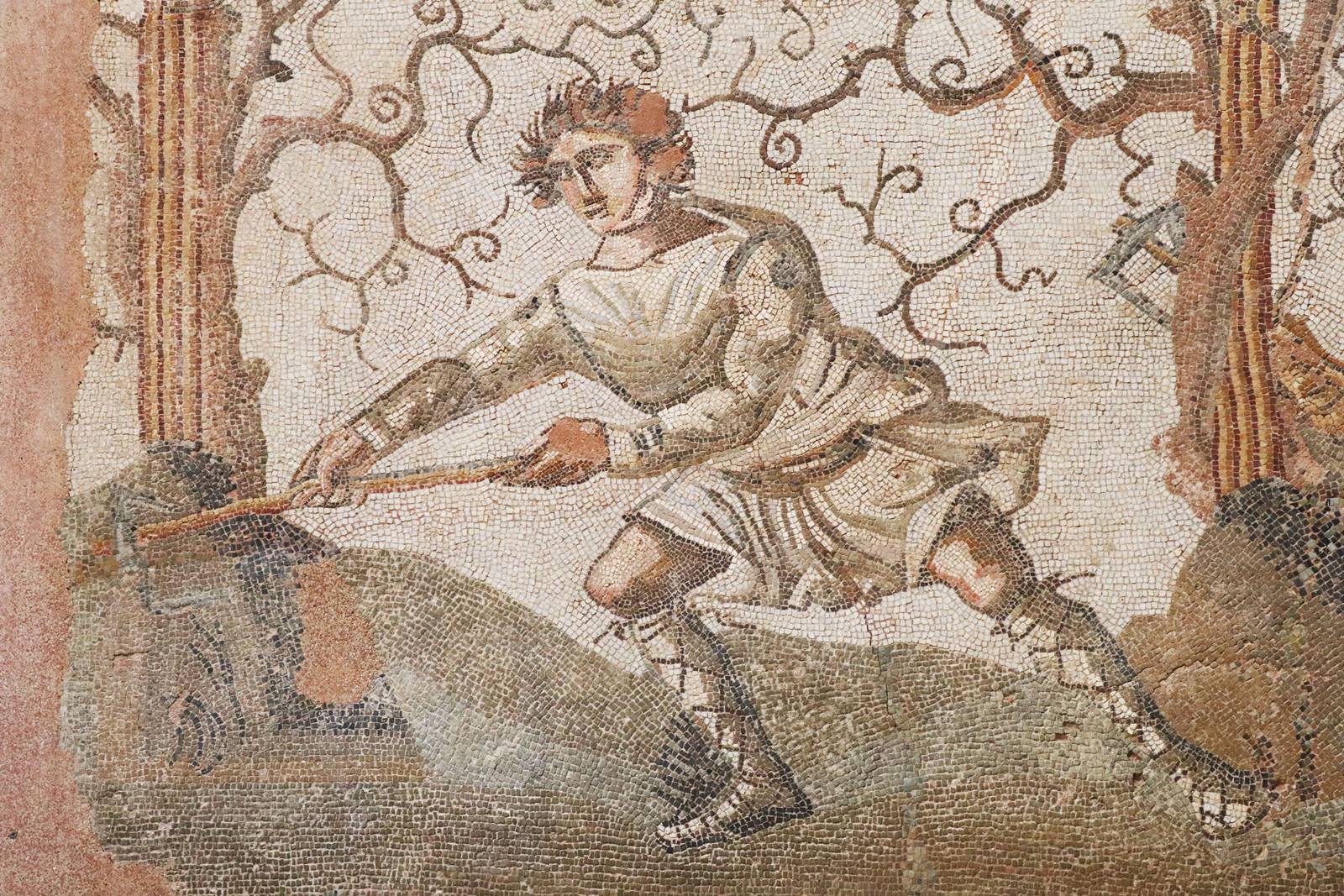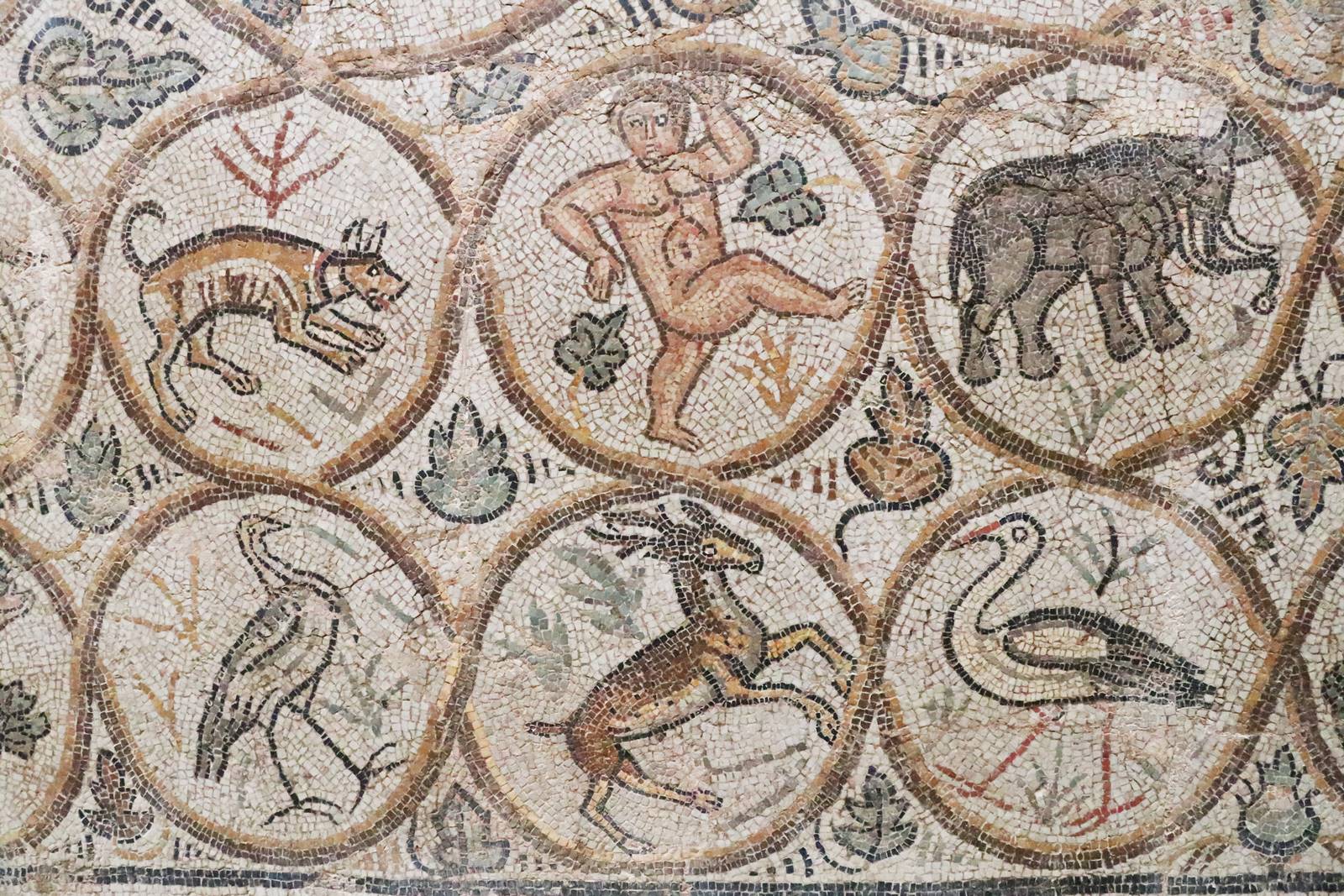 Cette mosaïque qui décorait le sol d’une luxueuse villa date de l’antiquité tardive, 2e ou 3e siècle après J.C. Encadrées d’un rinceau d’acanthe, quatre scènes représentent le travail dans les champs. Dans cette scène, les paysans labourent un champ avec un attelage de boeufs tout en semant. Des oliviers poussent dans les champs. Par son traitement des couleurs et la mise en scène des personnages dans l’espace, cette mosaïque est considérée comme un chef d’oeuvre.
