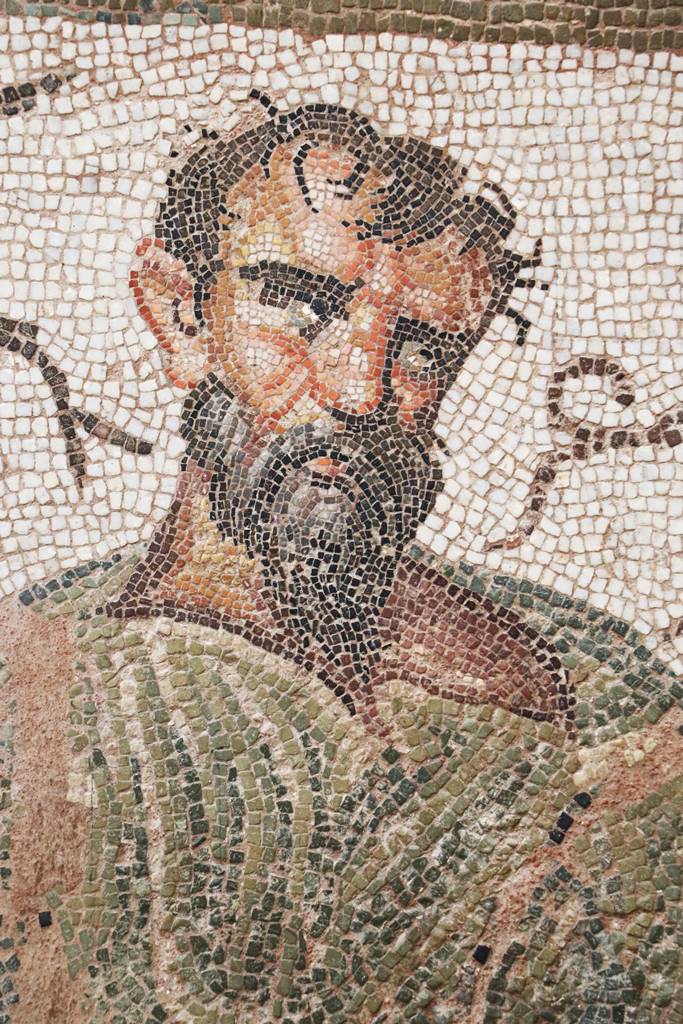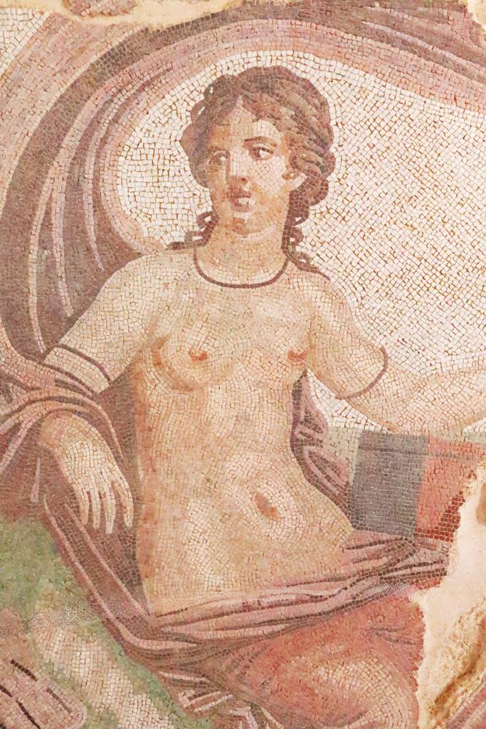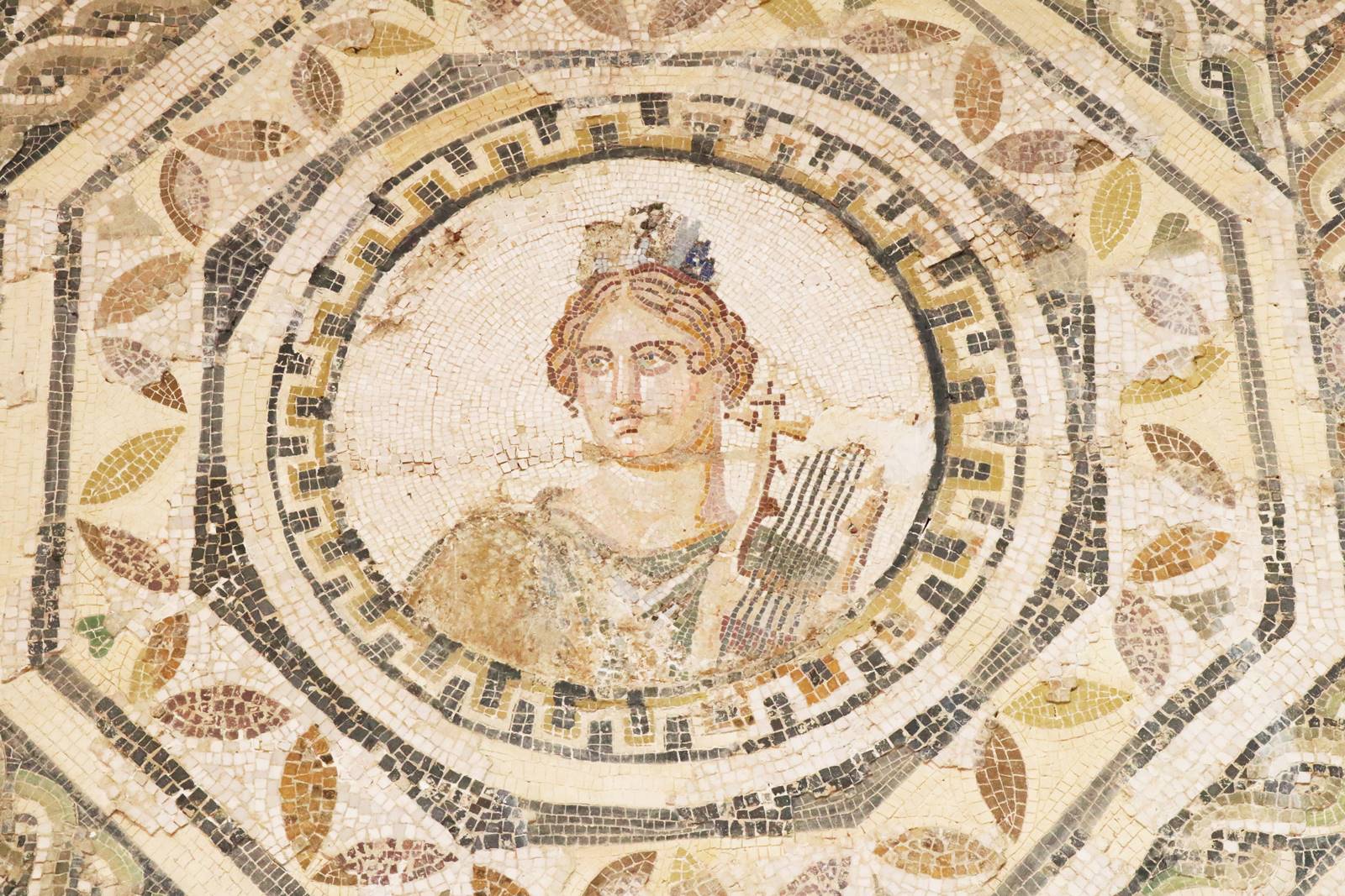 Dans la culture antique gréco-romaine, les muses sont synonymes de connaissance et de savoir-vivre, conditions d’accès au bonheur. Au nombre de neuf médaillons représentant neuf figures féminines, cette mosaïque des Muses trouvée dans une noble villa affichait le prestige social du propriétaire qui était sans doute un homme de profonde culture.
