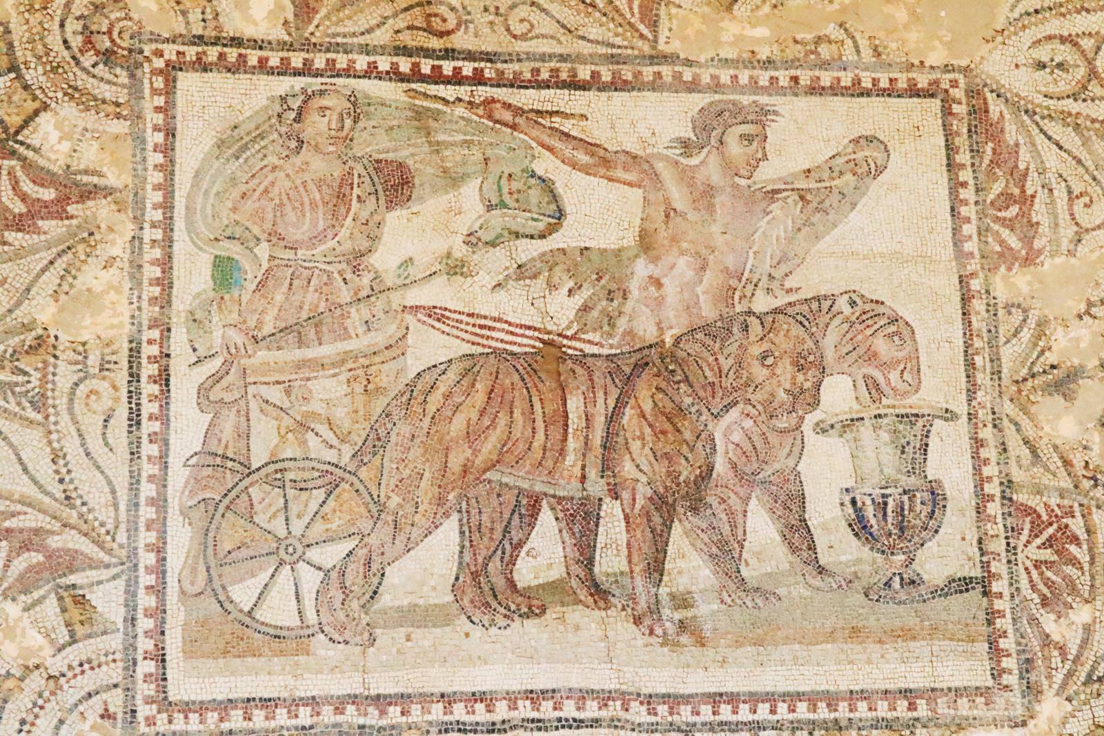 Cette grande mosaïque romaine pavait la pièce de réception d’une vaste demeure. L’encadrement est fait du motif courant de la double tresse décoré de rosaces, coquilles, palmettes et volutes délimités par des arcs cercles donnant l’illusion d’un tapis richement colorié. Le tableau central représente un triomphe bachique. Sur un char traîné par des tigres et conduit par Satyre se dresse un personnage, Ariane ou Dionysos.