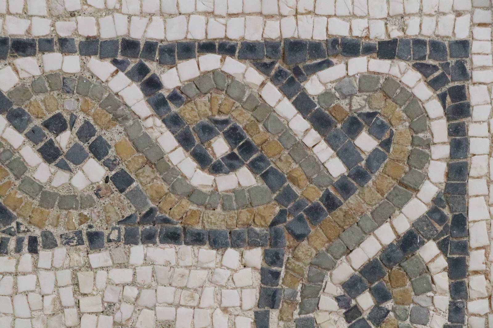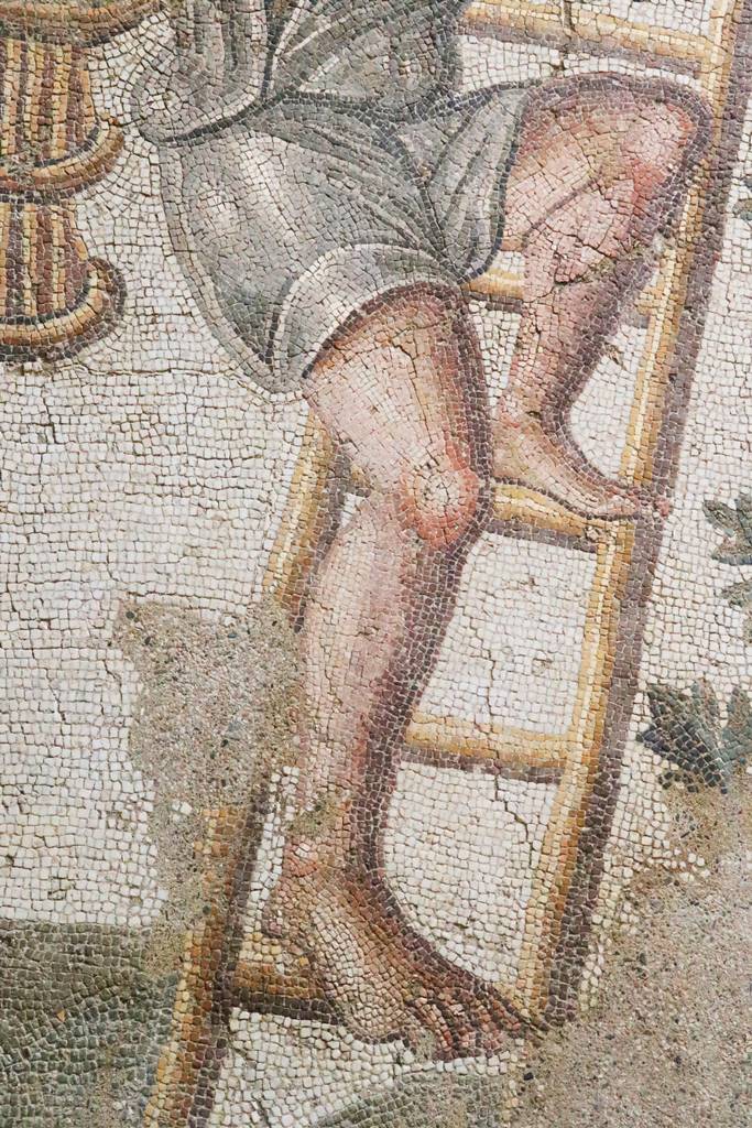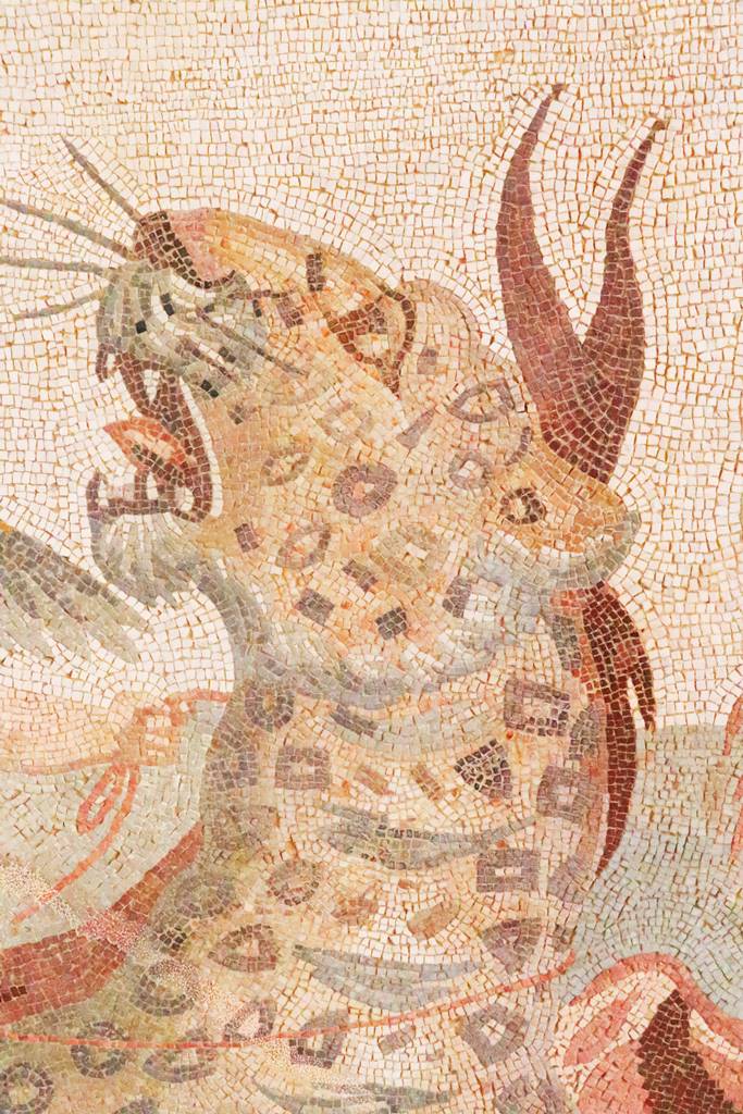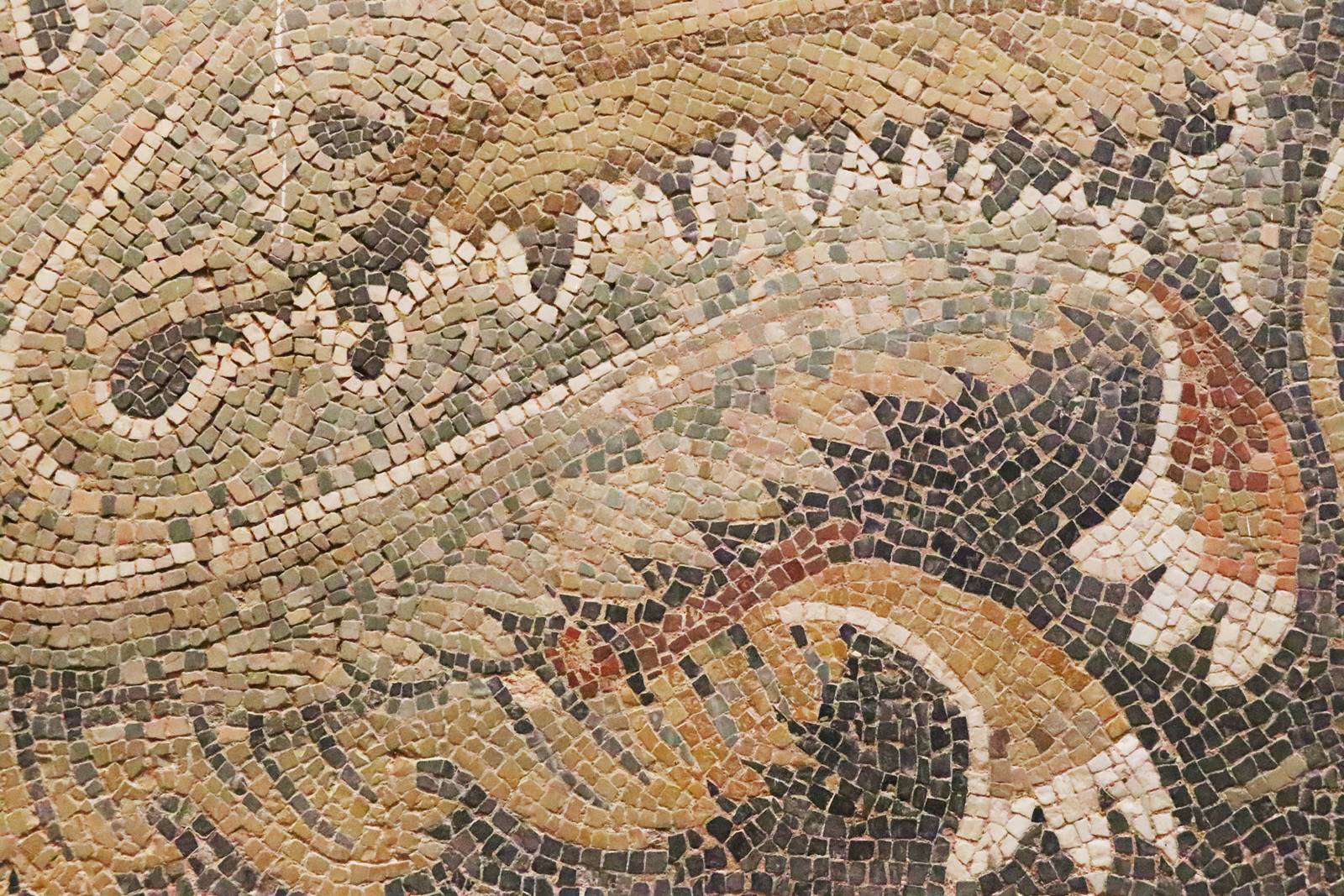 Détail de la grande mosaïque de l’Asinus Nica, ‘L’âne vainqueur’, étrange association entre Asinus en latin et Nica en grec. L’âne chez les chrétiens est le symbole d’humilité tandis que chez les Romains utiliser un âne est un signe de basse extraction. Cette mosaïque serait l’oeuvre d’un païen qui tourne en dérision le christianisme triomphant. Cette oeuvre ressemble beaucoup aux pavements orientaux du 6e siècle. Elle est unique dans toute l’Afrique romaine.