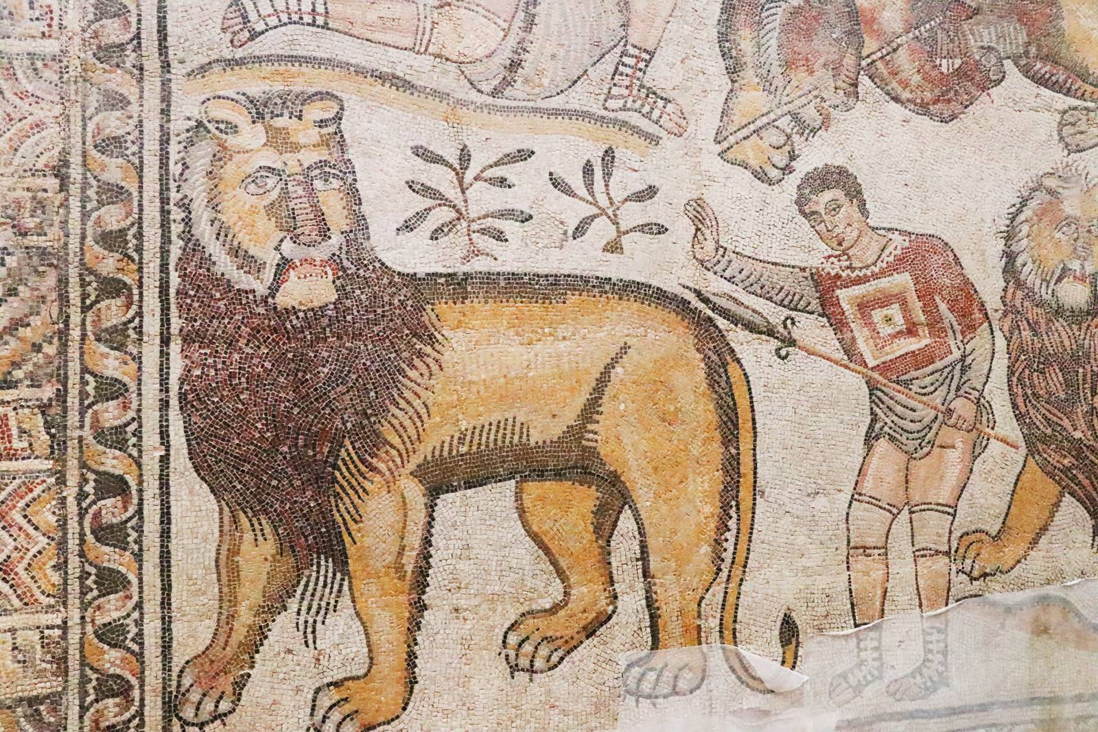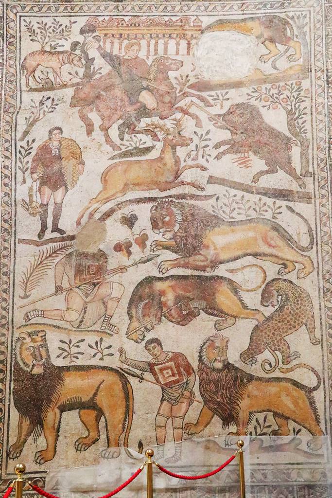 Dans la partie supérieure de la mosaïque de la Grande Chasse, le cavalier frappe à mort un sanglier. Un chien regarde la scène. Dans la seconde scène, un chasseur, un filet sur l’épaule, tient à la main un lièvre. La partie inférieure évoque une chasse au gros gibier avec deux vénators, des gladiateurs qui combattent des animaux sauvages. Le premier agenouillé attend que le lion vienne s’empaler sur la lance qu’il tient à la main. Une lionne tente de retirer une lance de son flanc. Une panthère semble observer la scène avec nervosité. Dans la dernière scène, le second vénator semble encourager deux lions placides.
