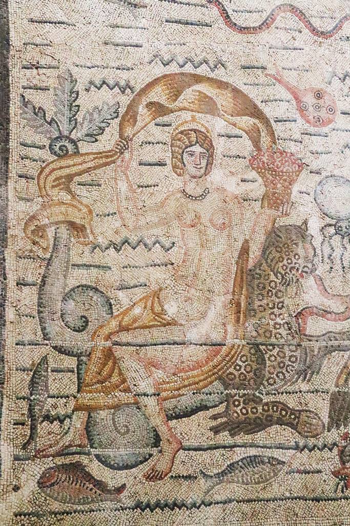 Aux quatre angles de la mosaïque sont représentées les Néréïdes, filles de Nérée et de Doris. Bienveillantes, elles accompagnent le voyage des marins, montées sur des dauphins ou des chevaux marins.