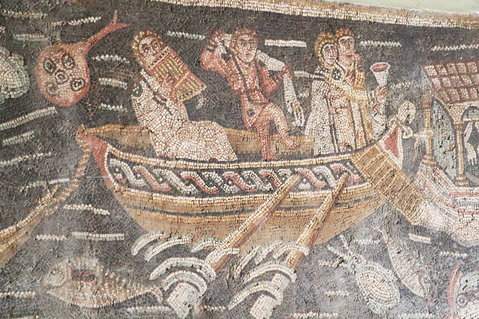 Une bordure de la mosaïque représente une barque à deux rames avec à son bord une femme et trois hommes. Ils viennent de s’amarrer devant un palais situé sur un piton rocheux. La femme debout tient une coupe de vin qu’elle élève dans un geste rituel. A l’arrière, un homme souffle dans une flûte de pan. Un danseur sautille au milieu de la barque.