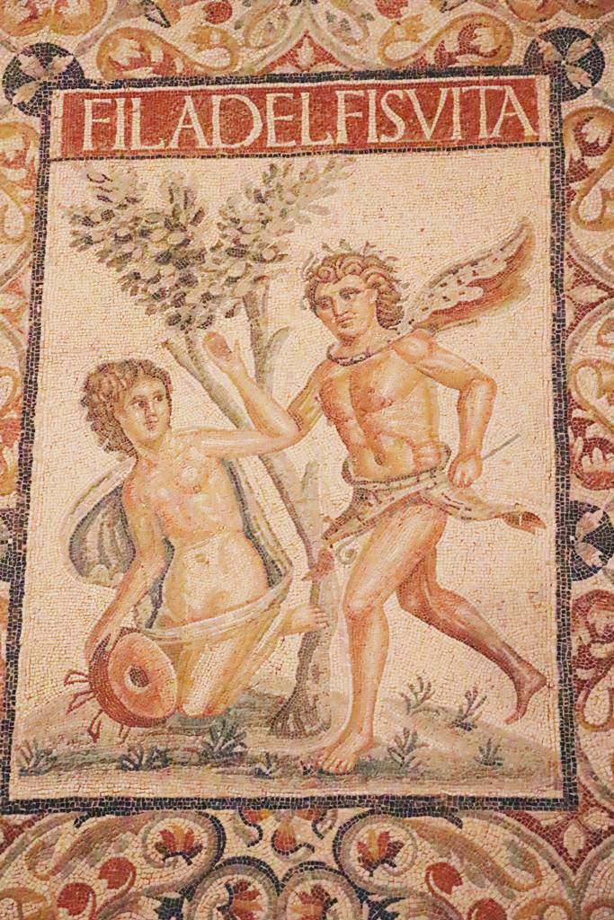 Datant du 4e siècle ap. J.C., ce grand panneau en mosaïque a été trouvé dans le vestibule d’une villa au pied de la colline. Les trois jeunes femmes nues et debout se tiennent par les épaules, celle de droite tenant une guirlande de fleurs. Ces trois grâces personnifient la beauté, la grâce et la poésie. Elles offrent des promesses de richesses et les garanties de la félicité.