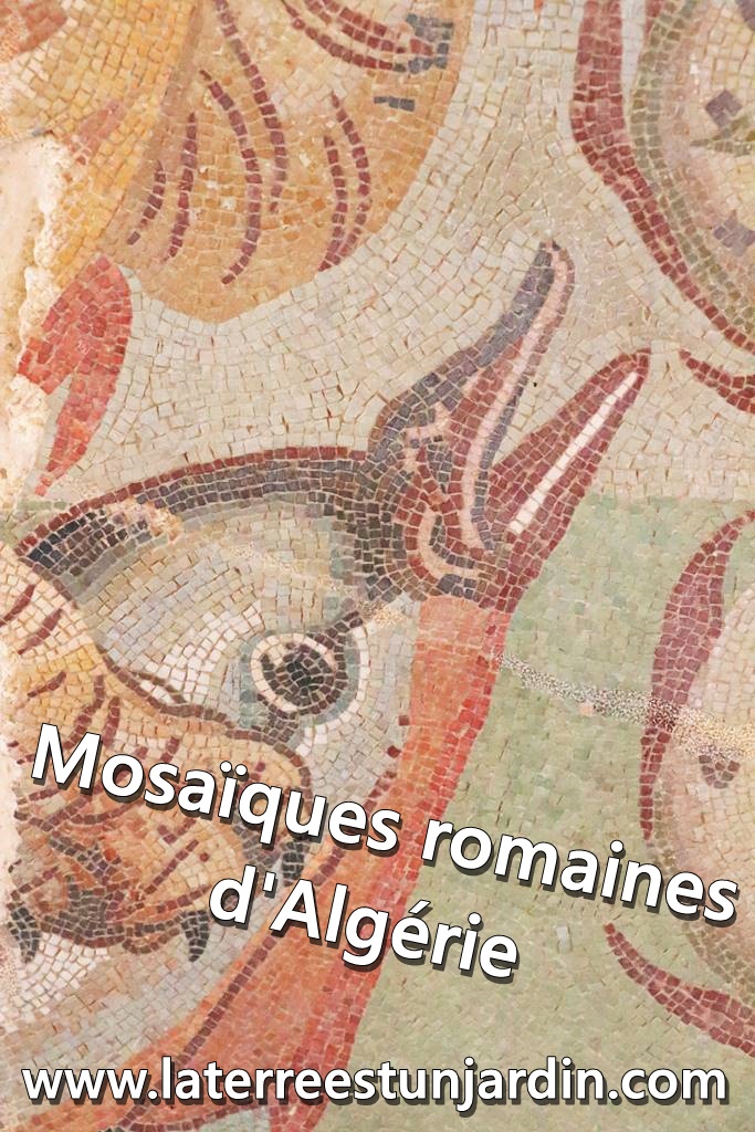 C’est lors de mon voyage en Algérie du Nord que j’ai visité les sites de Cherchell, Tipasa, Djemila et Timgad, des ruines romaines classées par l’Unesco. Dans les musées situés sur chaque site sont exposées d’étonnantes mosaïques romaines qui reproduisent avec précision le quotidien et les croyances des romains de l’époque. Les mosaïques tapissent pratiquement toutes les surfaces du sol des musées ou elles sont accrochées comme des tentures le long des murs. (voir mon reportage sur mon Carnet de voyage en Algérie)