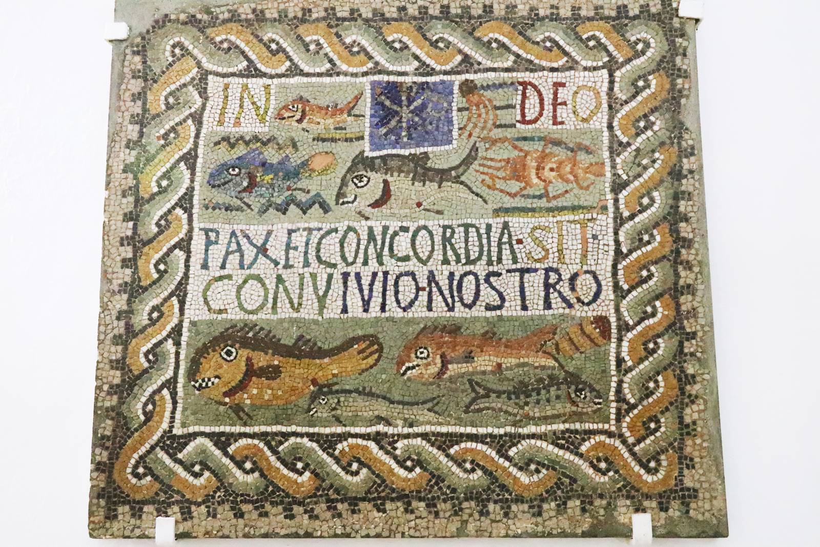 Trouvée dans la nécropole de Tipasa, cette mosaïque date du 4e siècle après J.C. De forme carrée, elle est encadrée de bandes entrelacées. A l’intérieur, bordé de poissons de la Méditerranée, un texte écrit «En dieu, que la paix et la concorde règne sur notre repas.» Cette mosaïque était posée en couverture d’une table funéraire. Les Romains prenaient souvent un repas sur la tombe d’un défunt croyant que son âme au ciel recevait le même honneur.