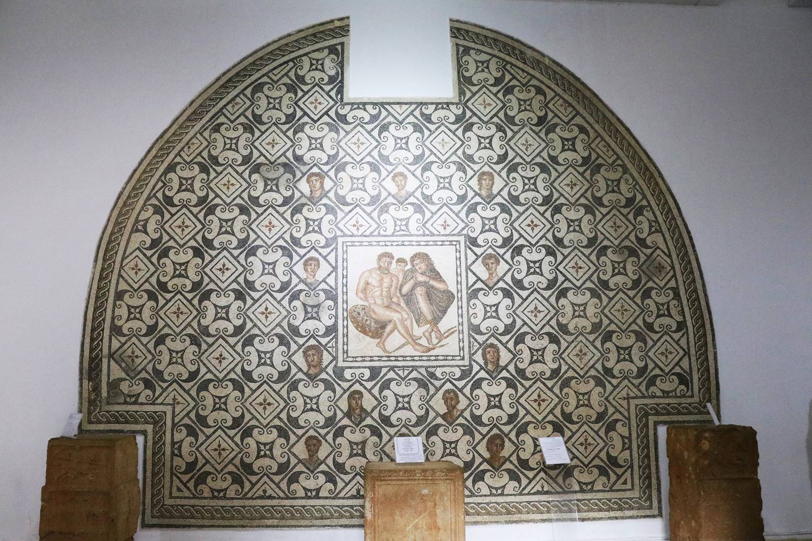 Douze médaillons en losanges représentent des portraits très réalistes d’Africains, soit des habitants de Tipasa ou d’autres groupes ethniques. La scène symbolise la suprématie romaine sur les populations, un avertissement pour toute insurrection dans l’empire.