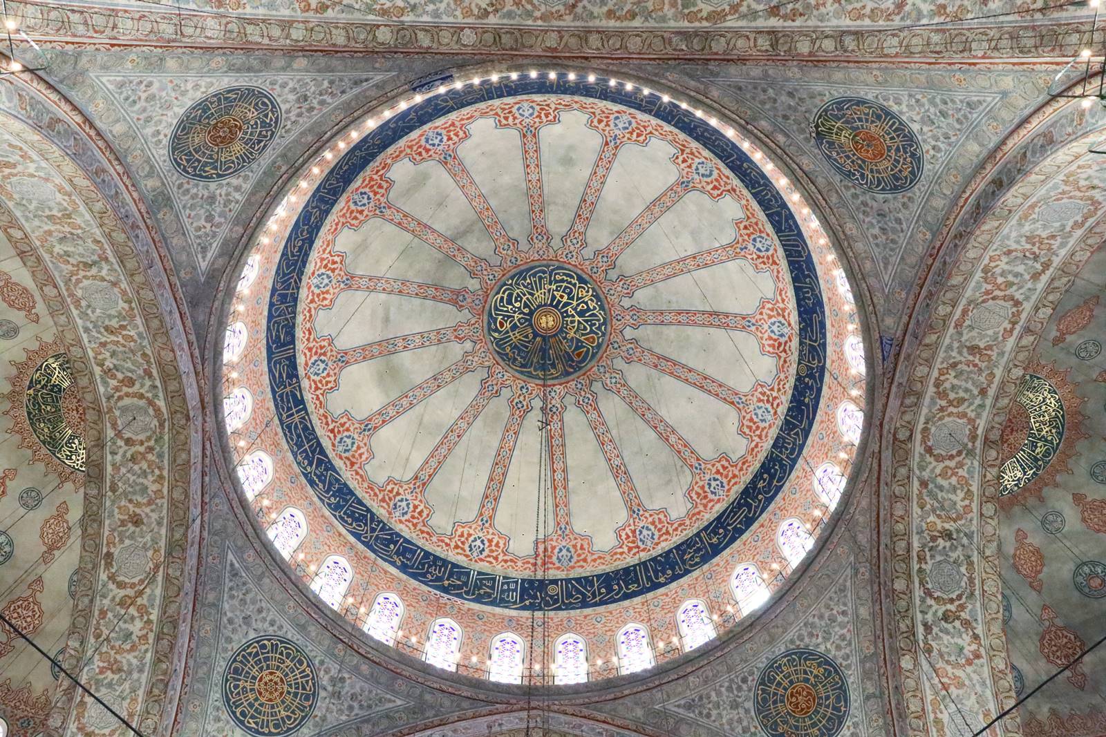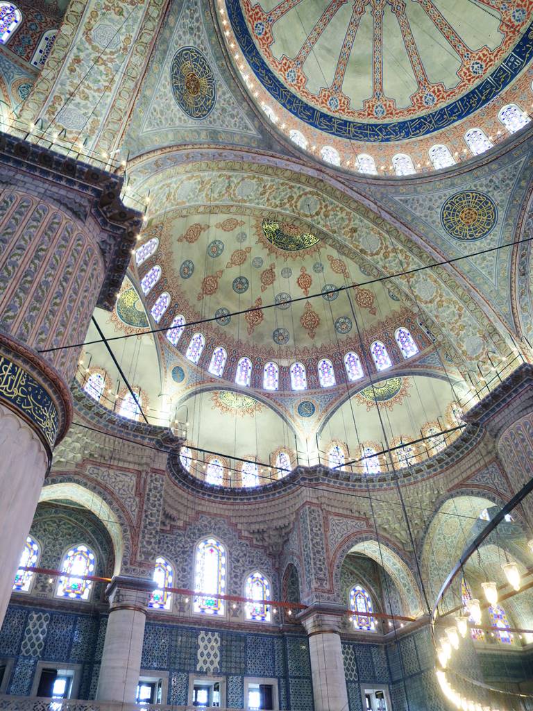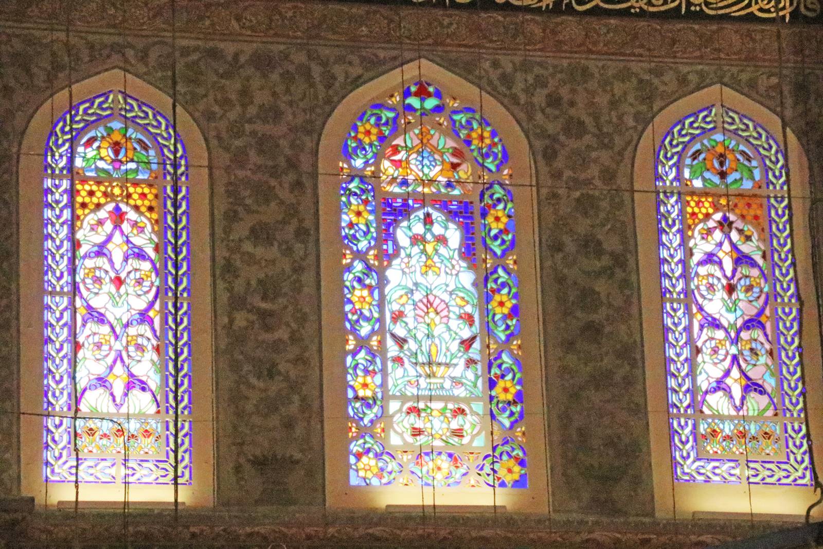 Plus de 200 vitraux avec des motifs complexes laissent passer la lumière naturelle, renforcée par l’éclairage d’un grand nombre de lampes qui étaient autrefois couvertes d’or et de pierres précieuses. Grâce à ses nombreuses ouvertures, 260 fenêtres placées à l’intérieur de la mosquée, le grand dôme semble être suspendu dans les airs. La mosquée, très lumineuse, baigne dans une ambiance bleutée inoubliable rehaussée par le pourpre des tapis de prières étalés sur le sol.