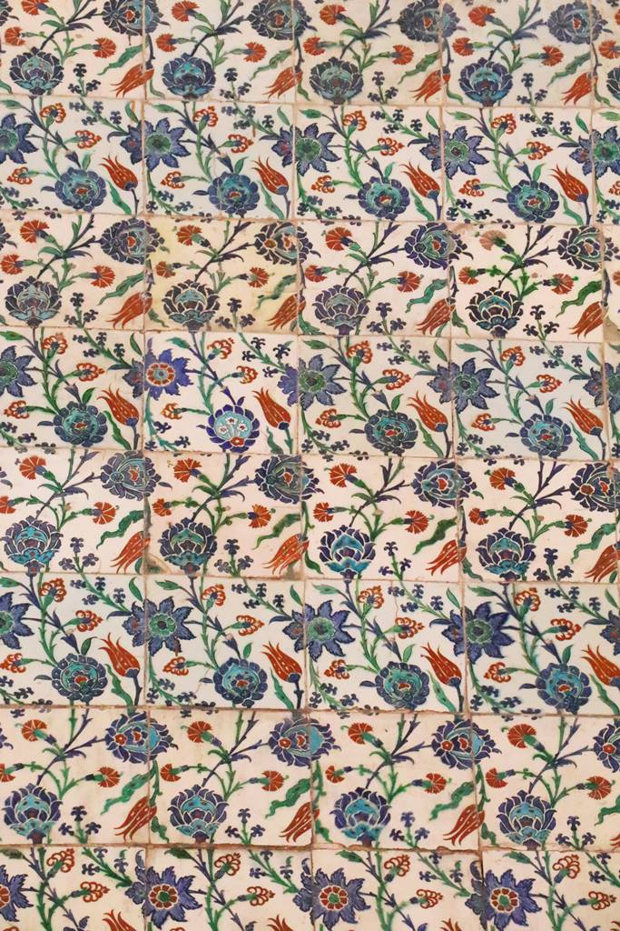 Réalisés par des artisans d’Iznik, l’ancienne Nicée, ils arborent des motifs floraux dont la tulipe, fleur favorite des sultans. Les motifs représentent la Terre au printemps ainsi que les jardins du paradis. Les calligraphies présentes sur les murs intérieurs de la mosquée ont été réalisées au 17e siècle. Elles reprennent des versets coraniques et des prières ainsi que certains attributs d’Allah en langue arabe.
