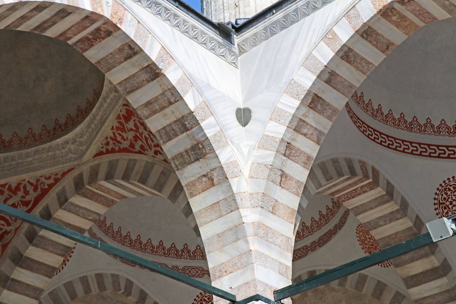 La mosquée est coupée du monde par un mur d’enceinte percé de cinq portes. C’est de la cour de la mosquée que partait la caravane sacrée des pèlerins pour La Mecque. La cour intérieure est entourée d’une galerie couverte composée de 26 colonnes de granit supportant trente coupoles. Son centre est occupé par une fontaine de marbre de forme hexagonale reposant sur des colonnes et décorée de motifs floraux.