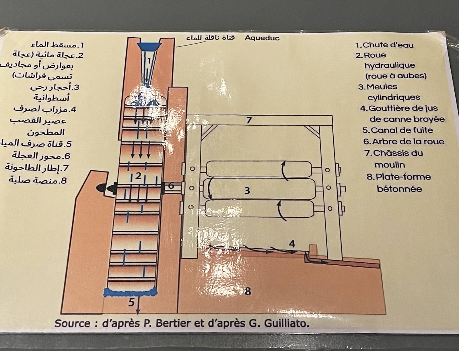Quelques rares moulins à eau fonctionnent encore dans différentes régions du Maroc. Les chroniques mentionnent plus de 400 moulins à eau à Fès au 11e siècle. L’eau est prélevée sur un canal d’irrigation ou d’un aqueduc ou déviée d’une chute d’eau ou d’un oued. Elle frappe les ailettes de bois de la roue du moulin ce qui entraîne la rotation d’une meule mobile sur une meule fixe. Les gens utilisaient le moulin à eau pour moudre leurs grains ou broyer la canne à sucre.