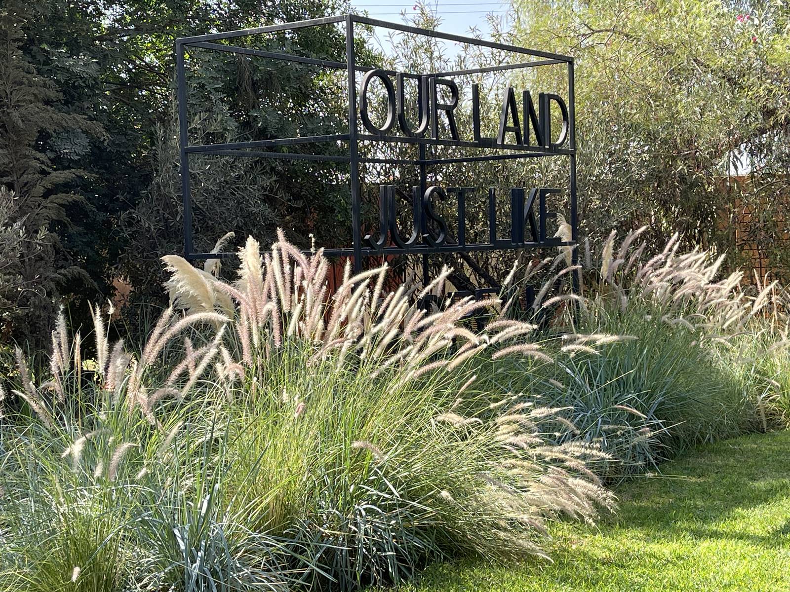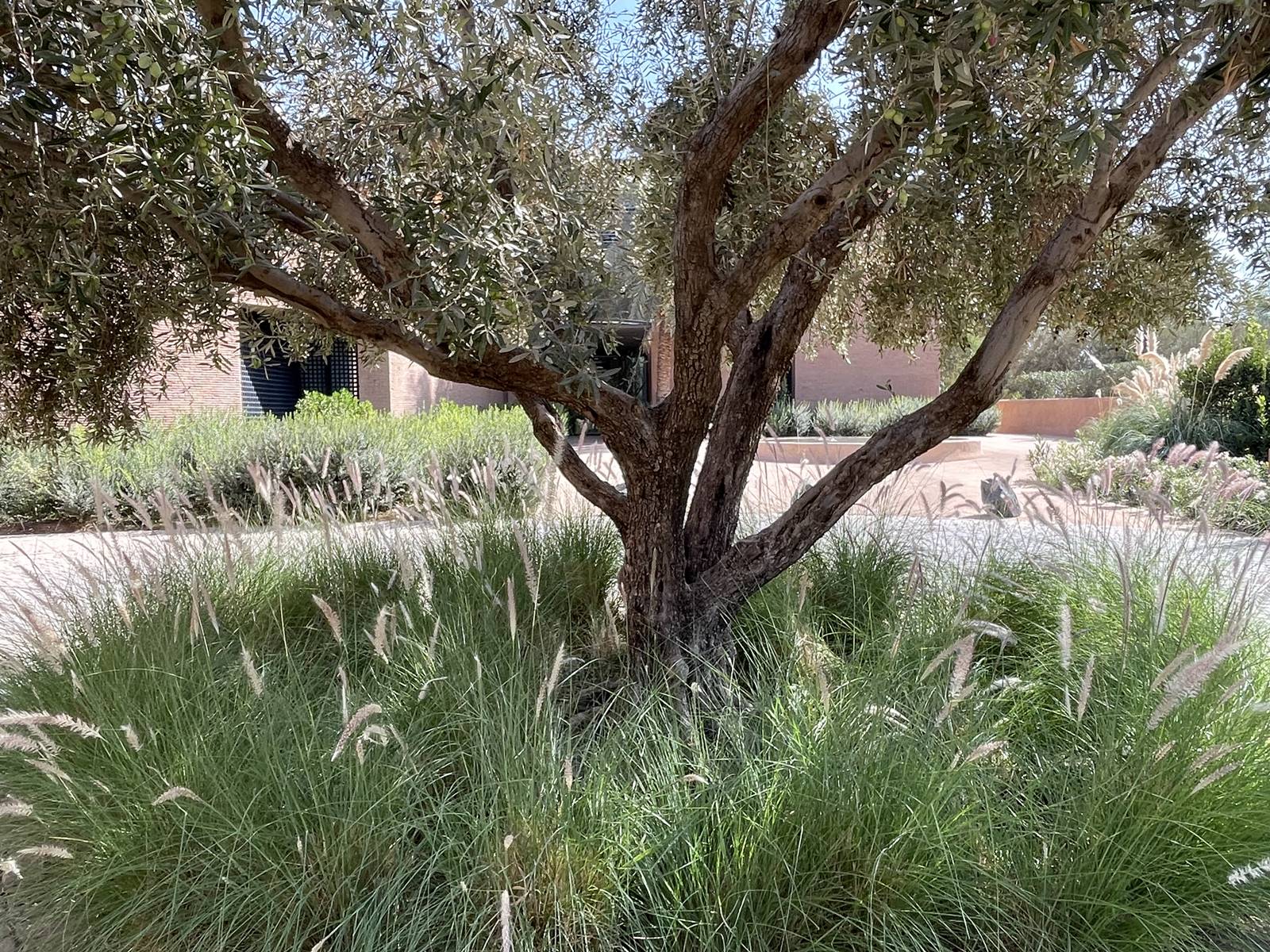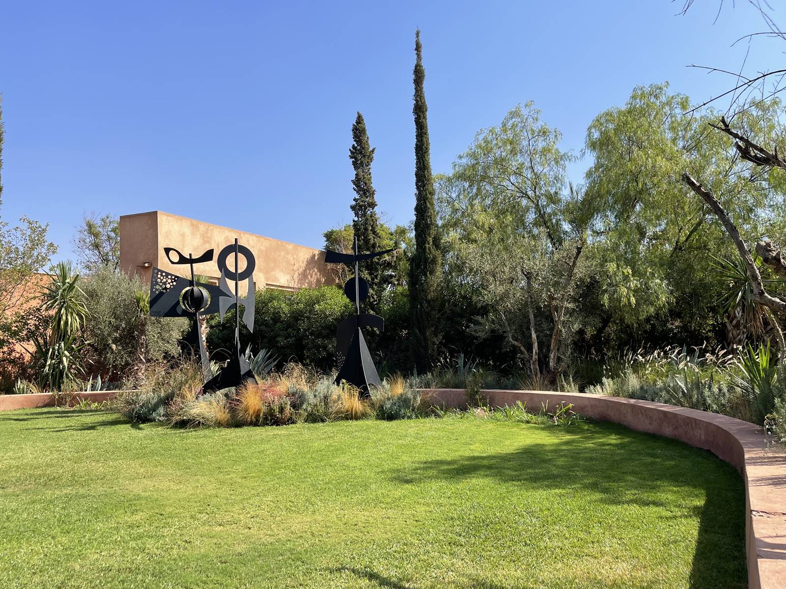 Des sculptures monumentales s’insèrent dans cet écrin paysager contemporain. On y admire les ‘Girouettes’, une sculpture en acier découpé avec un roulement à billes de Philippe Hiquily, les ‘Masques’, un bronze à patine verte de Mahi Binebine et ‘Our land just like a dream’ de Joël Andrianomearisoa.