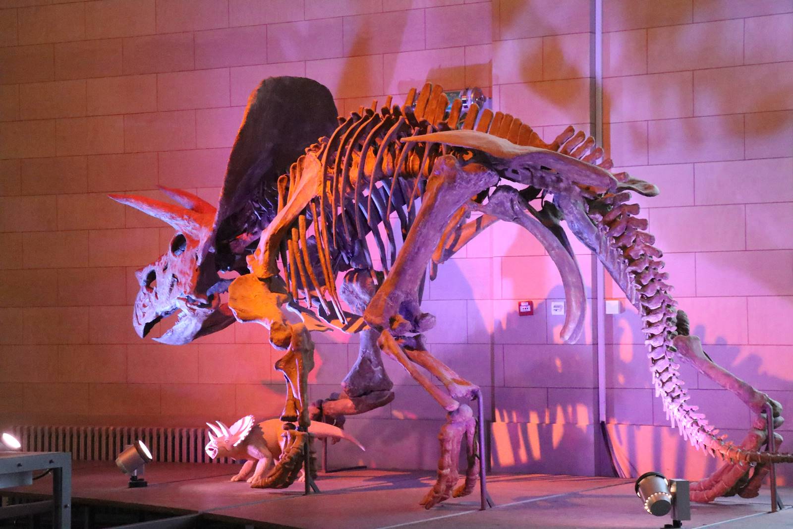 Centrosaurus apertus (-76.500.000 et -75.000.000 ans), moulage d’un spécimen découvert au Canada. Ce «lézard à pointe» est un grand dinosaure herbivore du Crétacé supérieur. En plus d’une corne nasale, sa collerette protégeait sa nuque. Il possédait une solide mâchoire destinée à la mastication de matériaux ligneux.